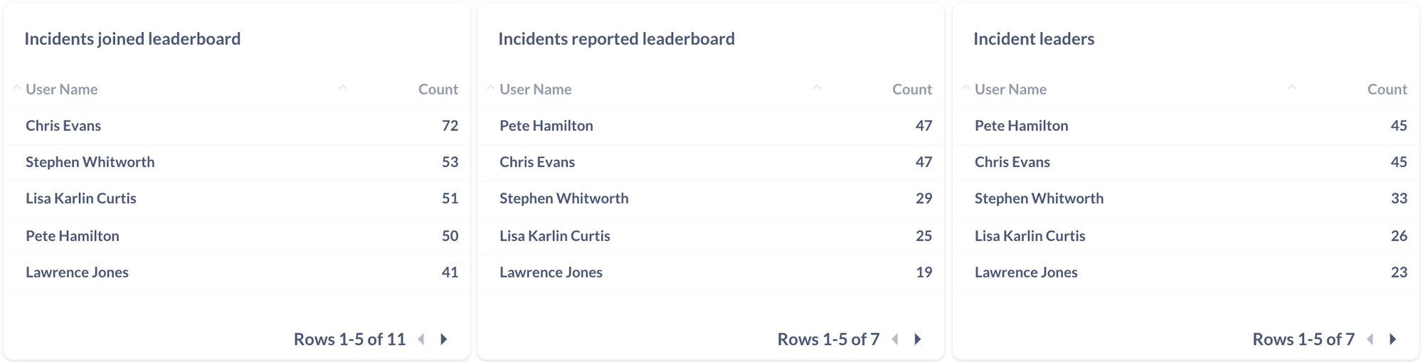 Everyone loves a little healthy competition. This tab shows you top incident responders: people who report the most incidents, lead the response, or just come to help out.