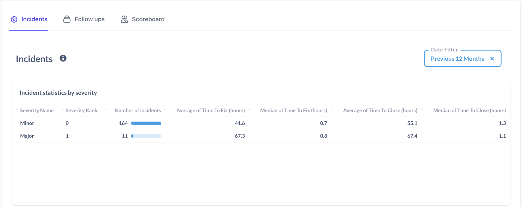 This is where you'll find high-level metrics like median time-to-fix, and a chart of incidents reported by severity: