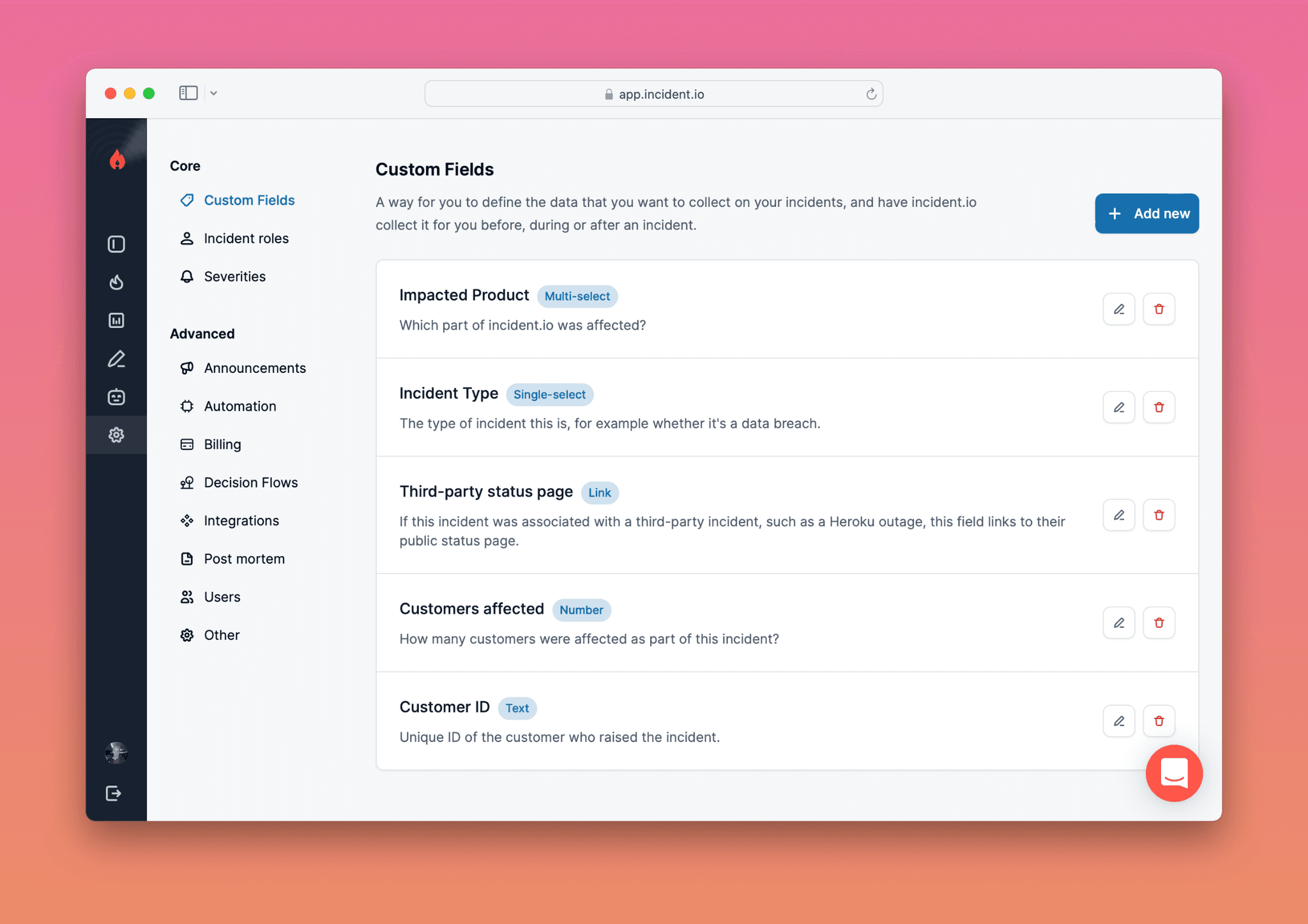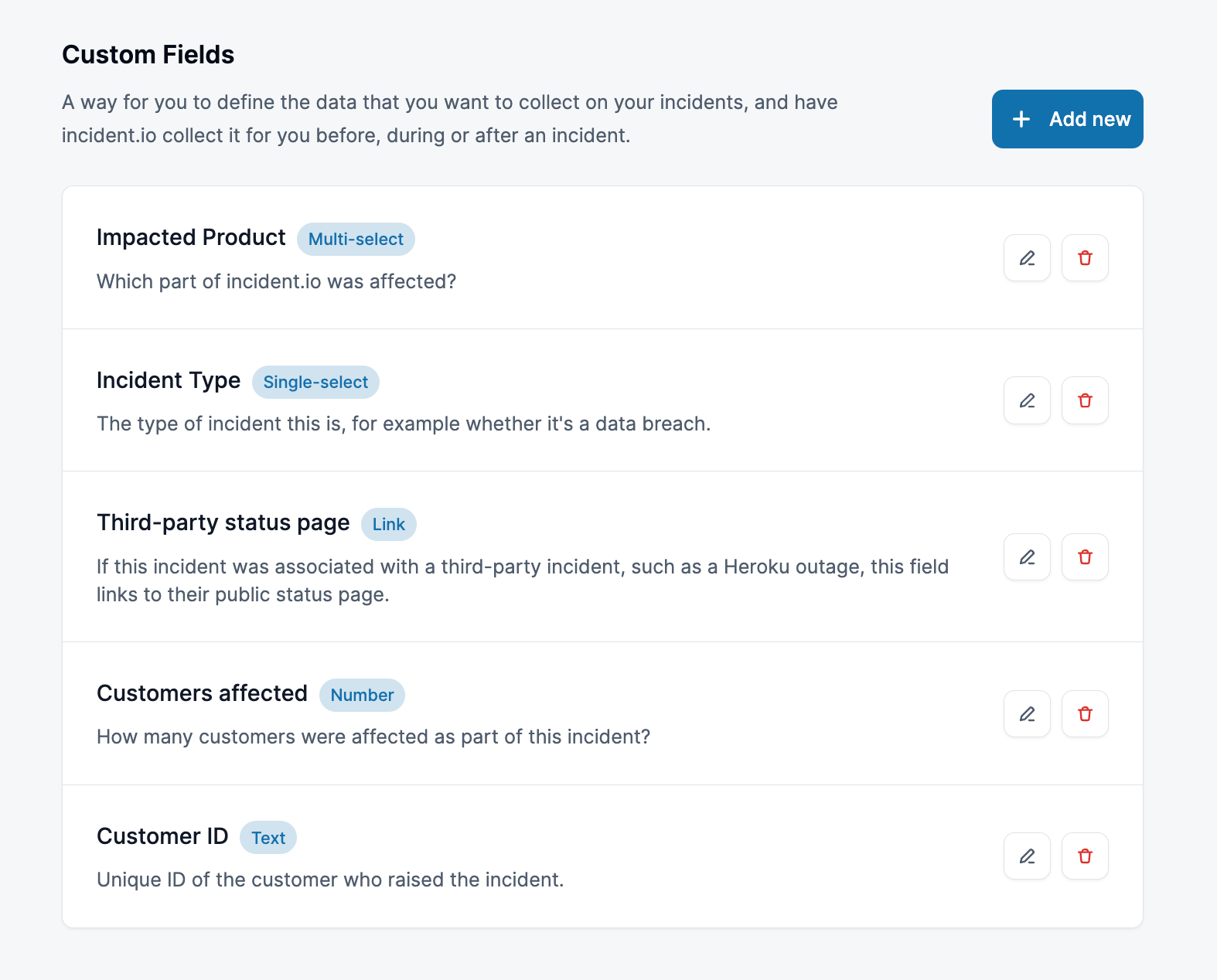 Custom fields are a key part of incident.io, helping you catalog past incidents, analyse trends and integrate with workflows and announcement rules.