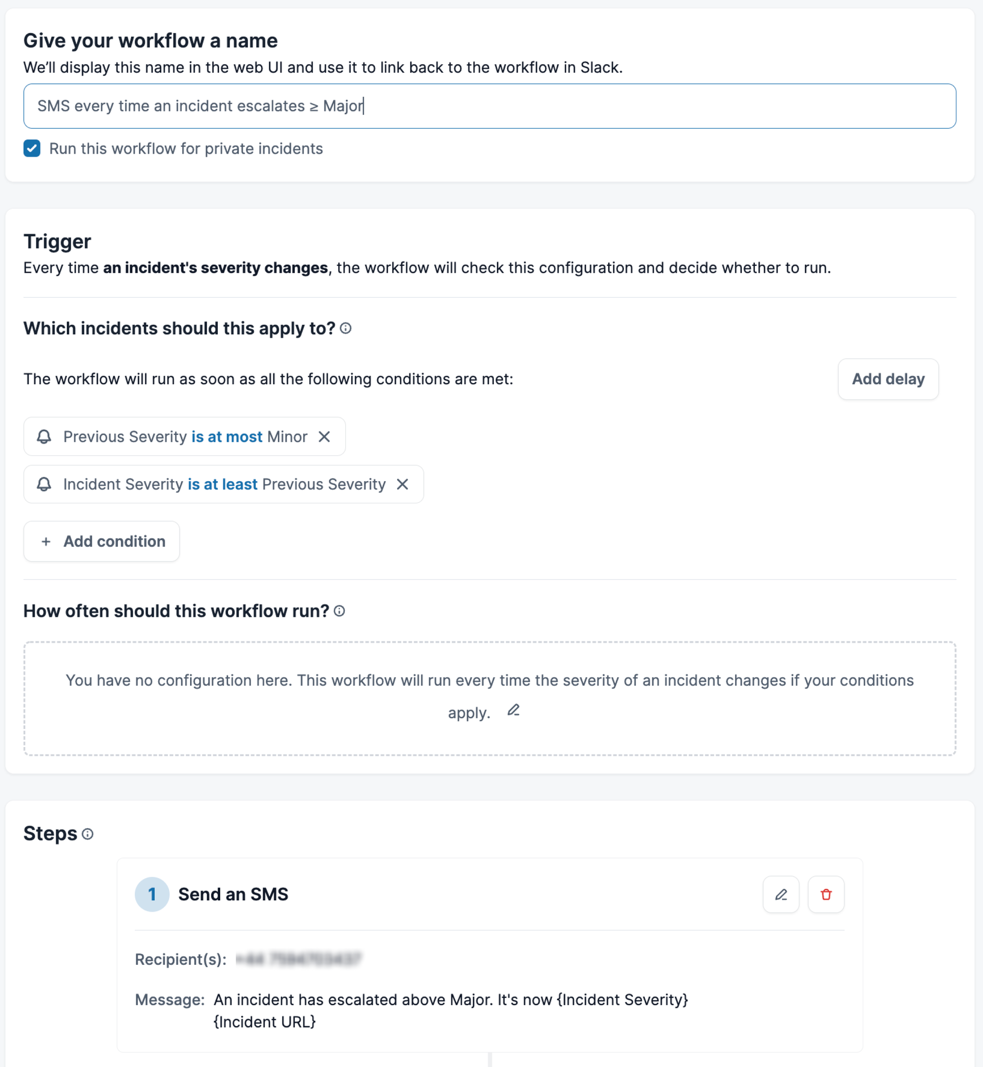 For example, this workflow would text me every time the incident severity increases to a value of Major or Critical. It would not text me if the severity decreased (e.g. from Critical to Major).