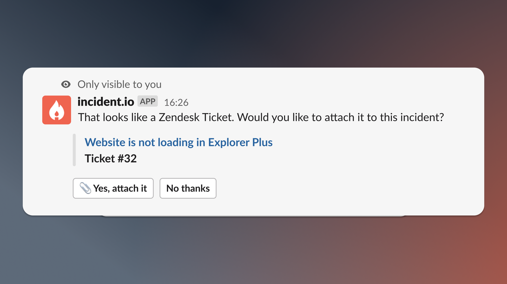 Now, we're adding support for Zendesk Tickets. Simply paste a Zendesk link into an incident channel, and we'll do the rest.