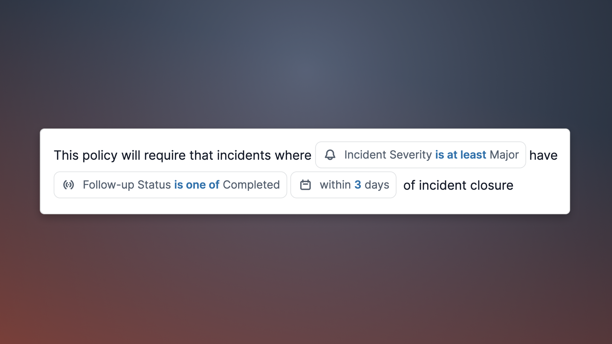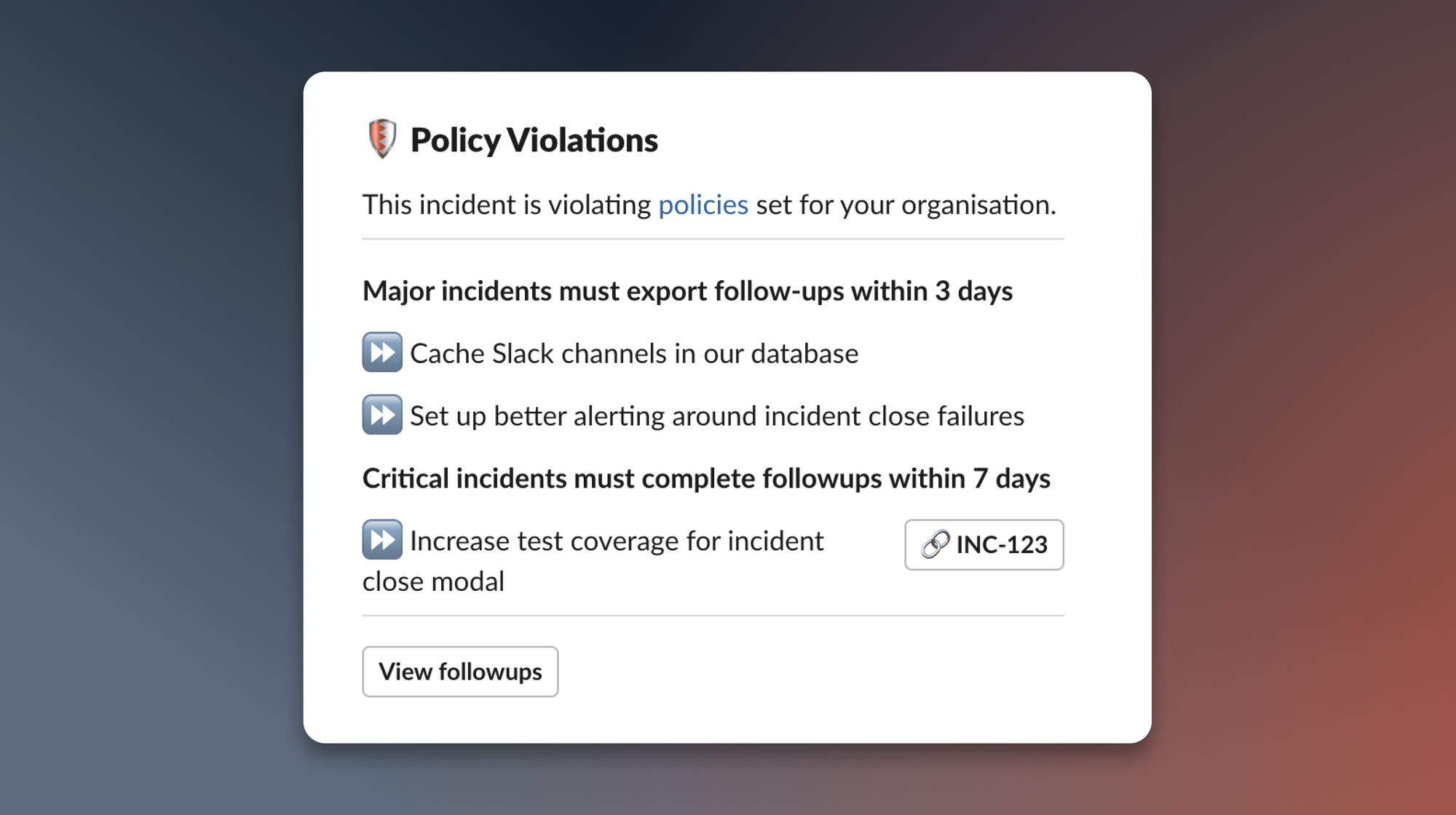 Currently, you can add rules around follow-ups, but we're just getting started. Soon, we'll be adding the ability to define rules around incident debriefs (AKA post-mortems), so you can ensure the entire post-incident process goes to plan. If you've got ideas about what else you'd like to use policies for, we'd love to hear them so please drop us a message.
