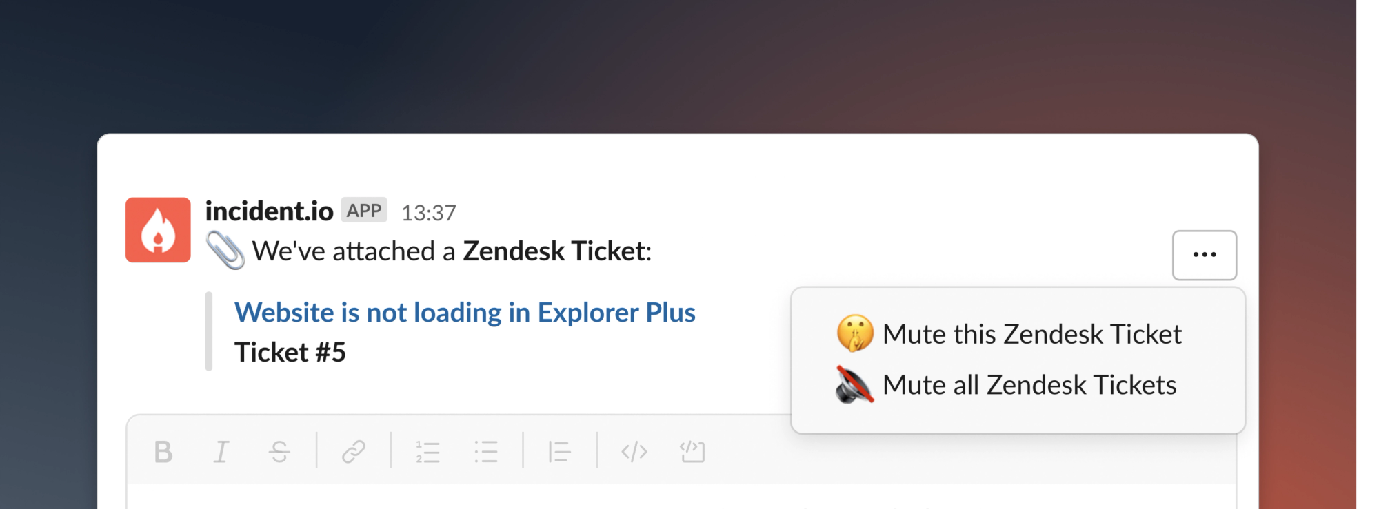 It's not just policies we've been working on! We've also added the ability to mute both a single attachment and all messages from a specific type of attachment. If you're finding GitHub changes, or Zendesk Ticket updates noisy in your incident channels, we think you'll love this!