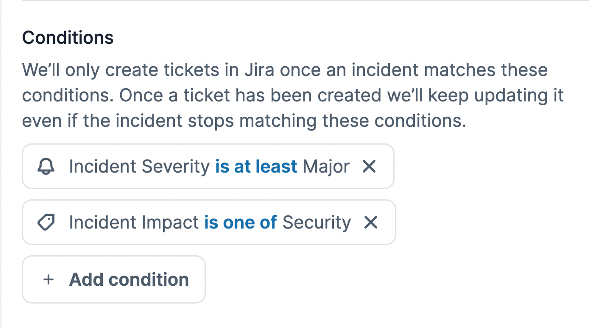 Using the same functionality as Workflows, you are able to configure the conditions an incident must meet before it is auto-exported to Jira. An example set of conditions is: auto-export to Jira when an incident has a severity of at least Major and is a Security incident.