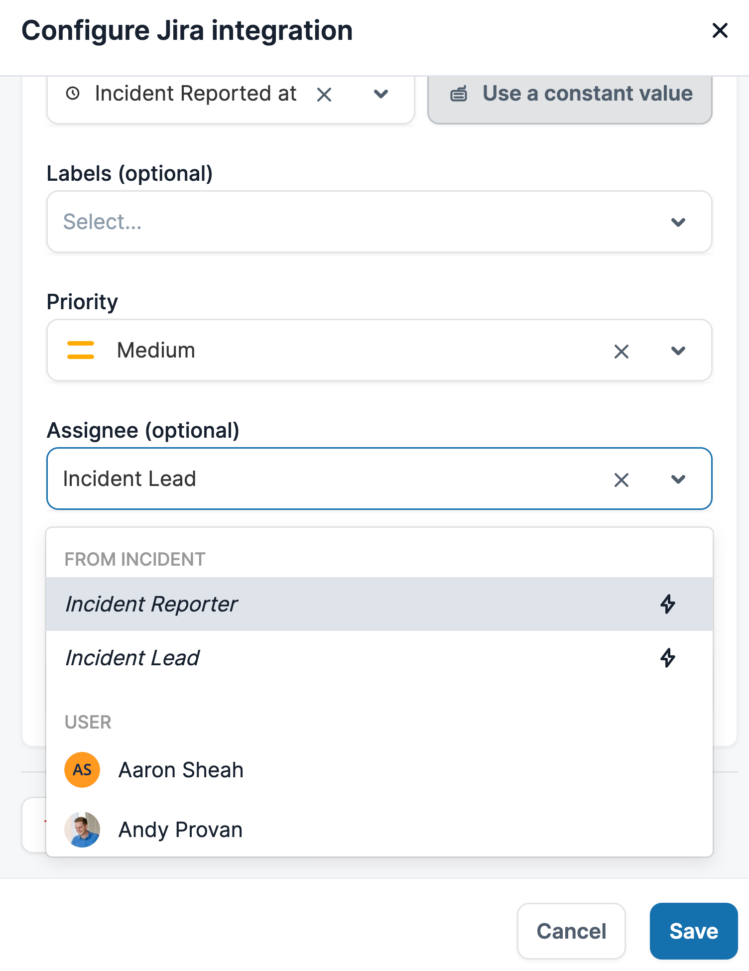 Once the Jira ticket is created, fields of the ticket will be kept in sync as incident updates occur. The fields can be set to be a constant value or a variable. For example, the "Assignee" field can be always be set to Bob (constant), or the Incident Lead (variable). If you choose Incident Lead, when someone is set as the Incident Lead during an incident, the assignee of the Jira ticket will be set to that user.