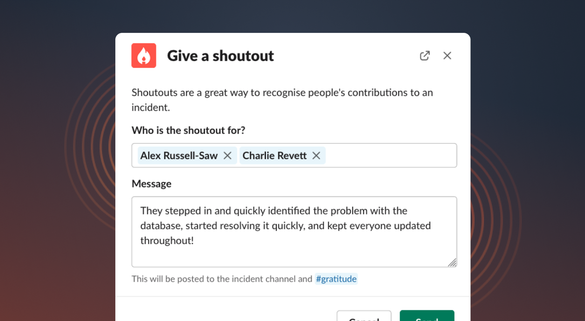 Recognise and appreciate the hard work and contributions of your colleagues during an incident by giving them a shoutout right from the incident Slack channel. Simply choose which colleagues you'd like to send a shoutout to, and customise your message to let them know how much you appreciate their efforts.