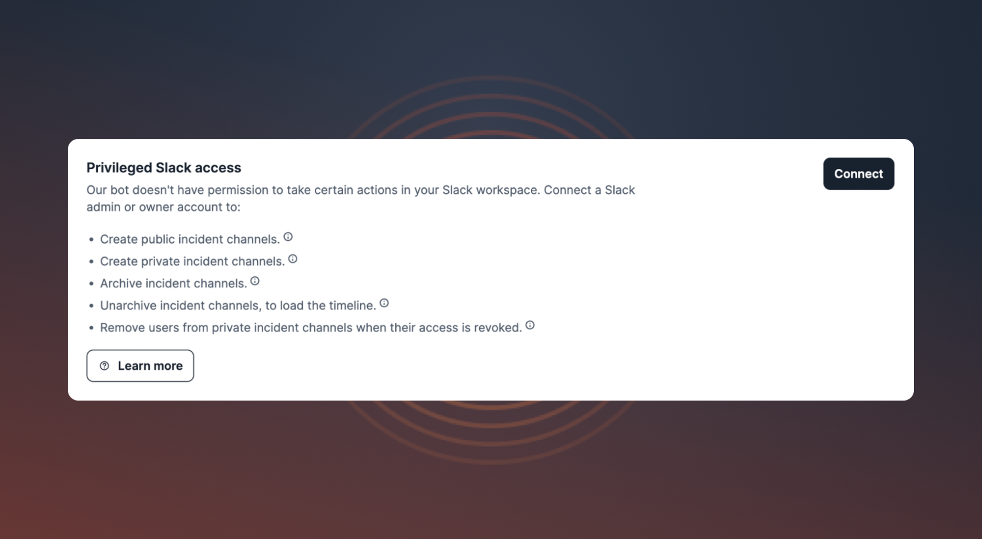 Slack allows workspace owners to restrict access to certain features (e.g. creating a new Slack channel), which also affects the incident.io Slack integration. We'll now ask for privileged Slack access when we need an admin to manage incident channels - find this on the new Settings → Security page.