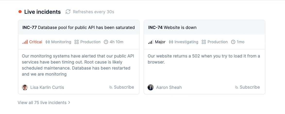 The incident homepage has also had a reskin, which optimises for more information density without compromising digestibility. A new tab for incident updates has been added, cutting through timeline noise so you can get up to speed quickly.