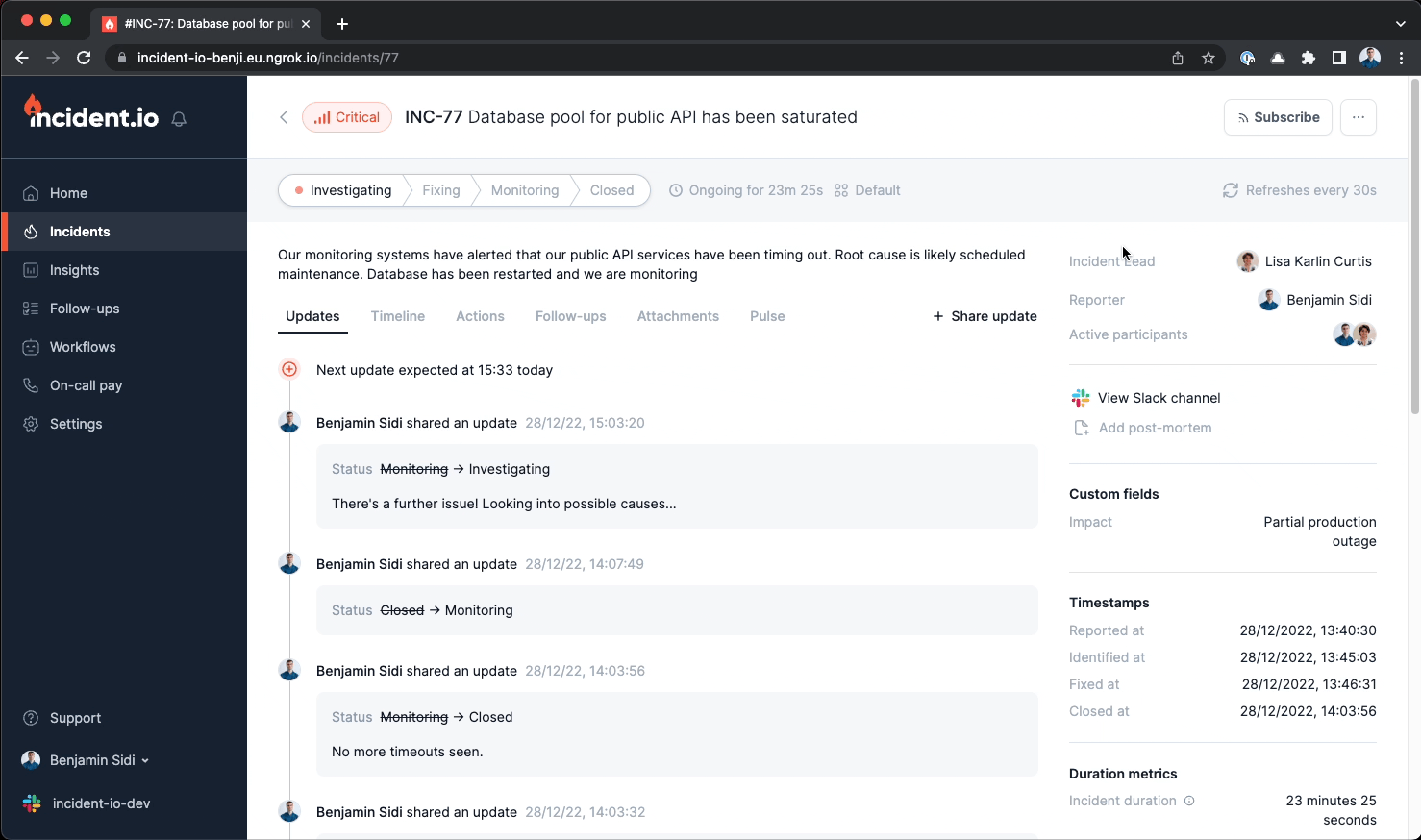 Just like the dashboard homepage, we've also added live-reloading capability to fetch the latest view of an incident.