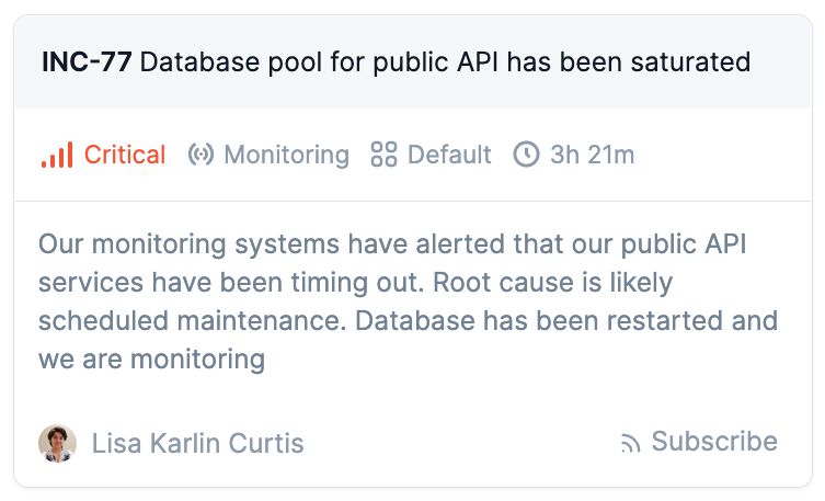 The top section has been completely reworked to give you a powerful overview of incidents happening in your organization. With one click, you'll be able to quickly subscribe to incidents you are interested in without having to leave the home view. If you want to dive into an incident's details you can click on a card and be taken to the incident homepage where you can learn more about it.