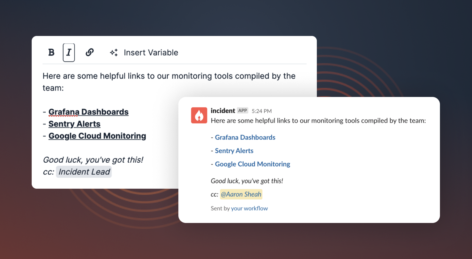 If you haven't configured a workflows step before, here are some examples of workflows that we've found to be helpful during an incident: