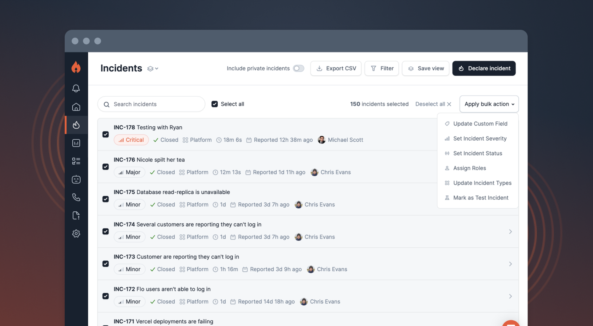 We've introduced bulk editing to our incidents list, letting you quickly select and update metadata on multiple incidents at once, such as: