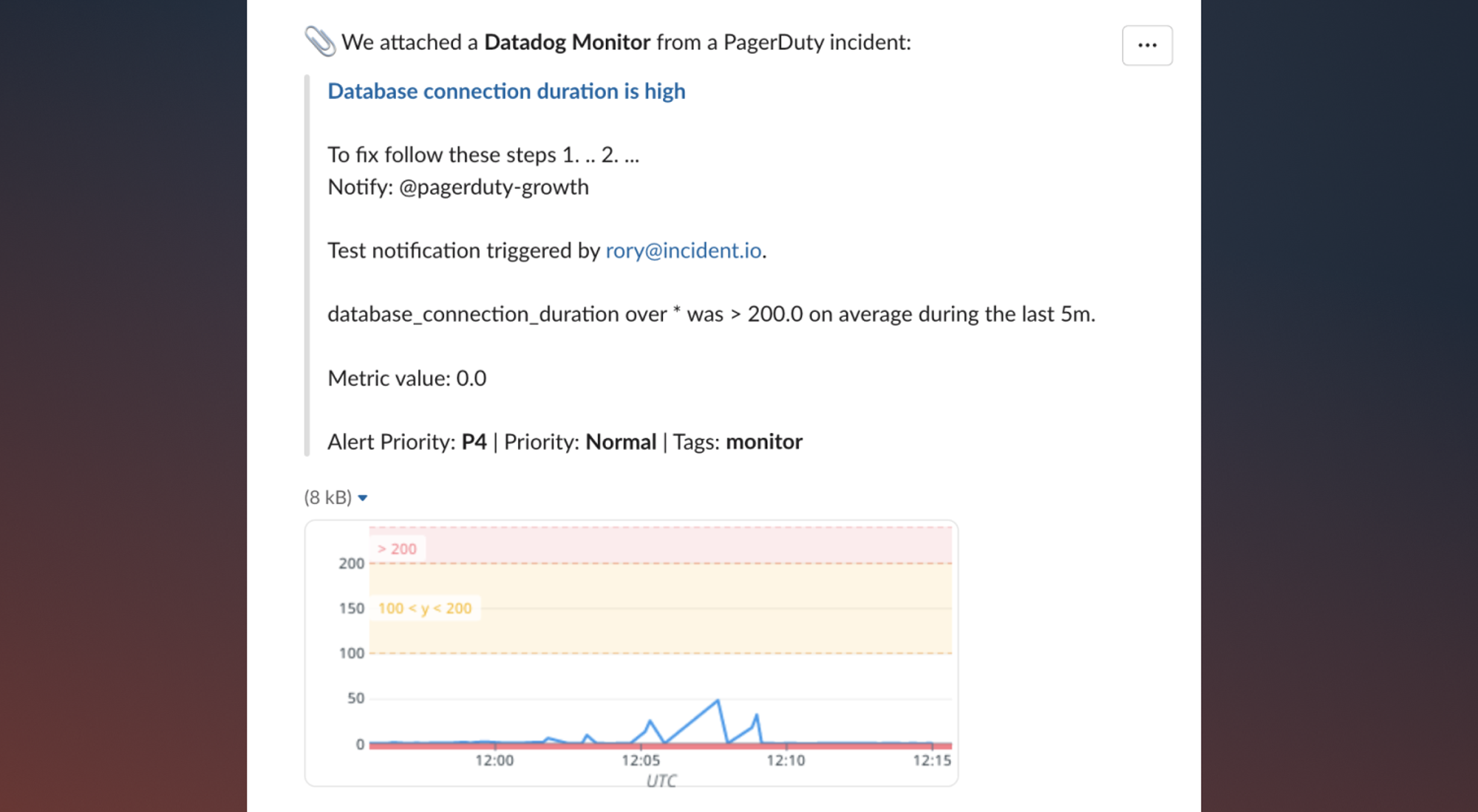 What's more, if you paste in the link to any Datadog snapshots, Slack will unfurl the image, and if you pin that message, incident.io will add the linked image to your timeline and attach it to your generated post-mortem.