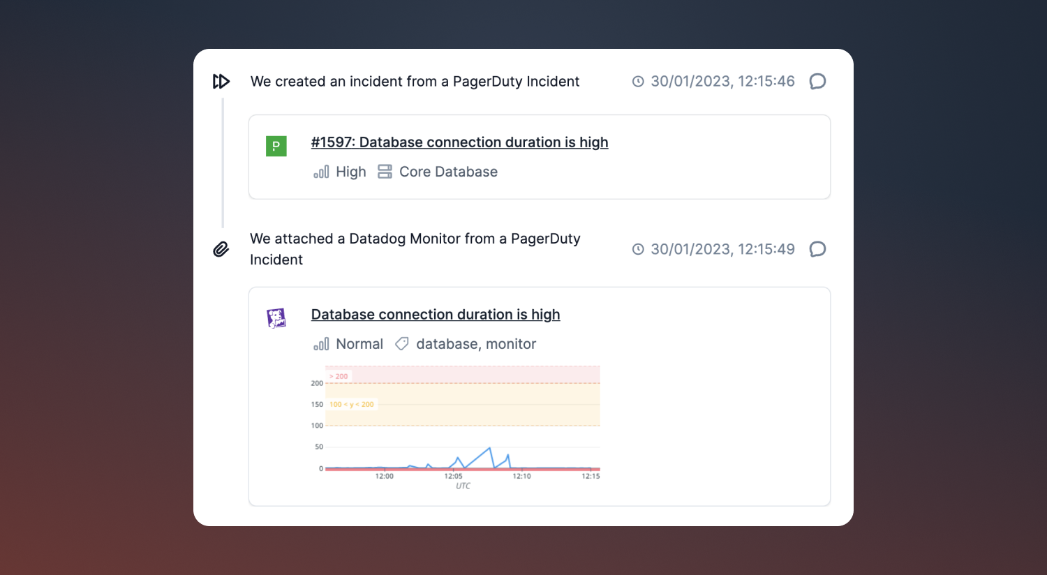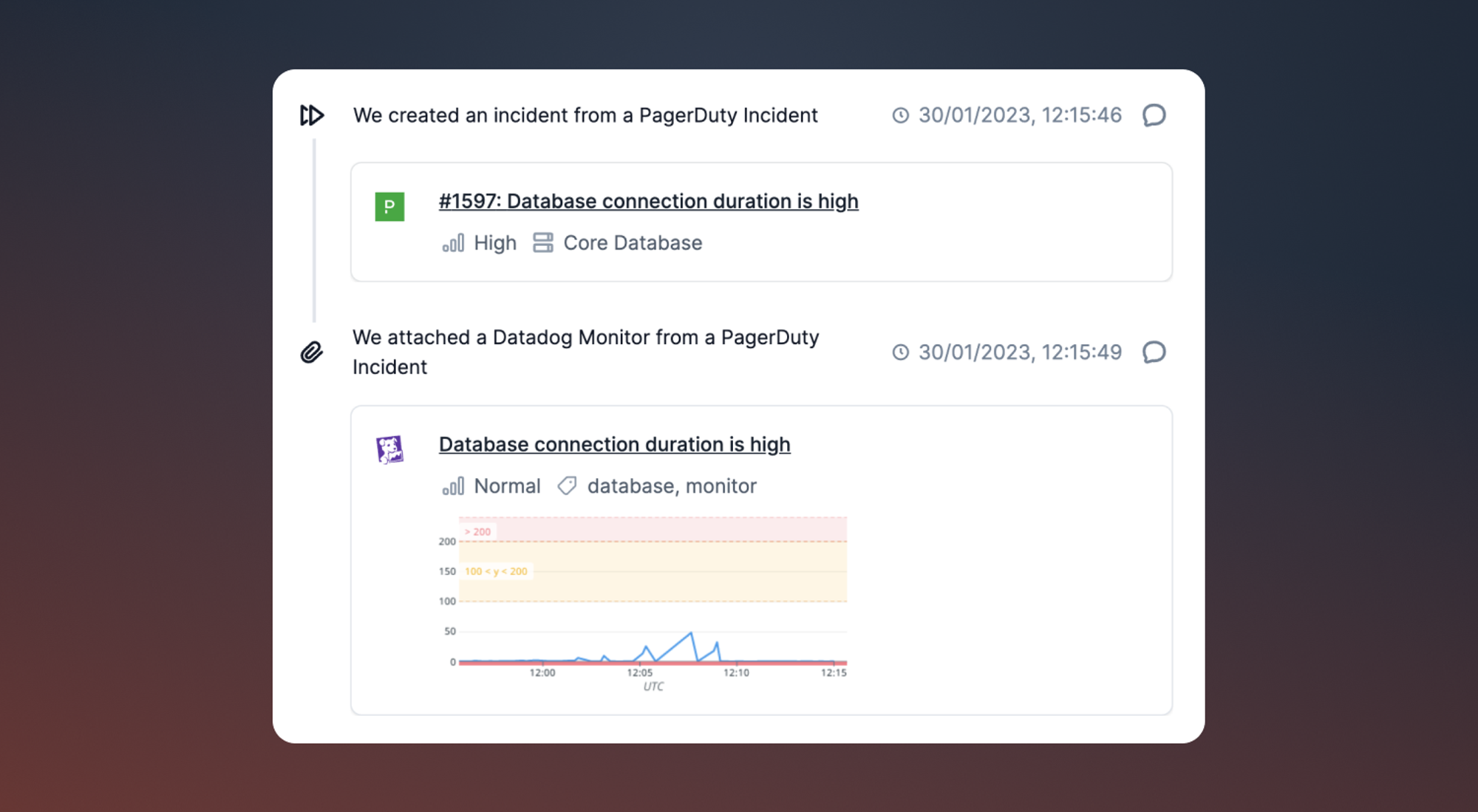 In addition to incident.io automatically pulling through Datadog Monitors, you can also pin Slack messages containing Datadog links and incident.io will put them on your incident timeline in the dashboard and in post-mortems.