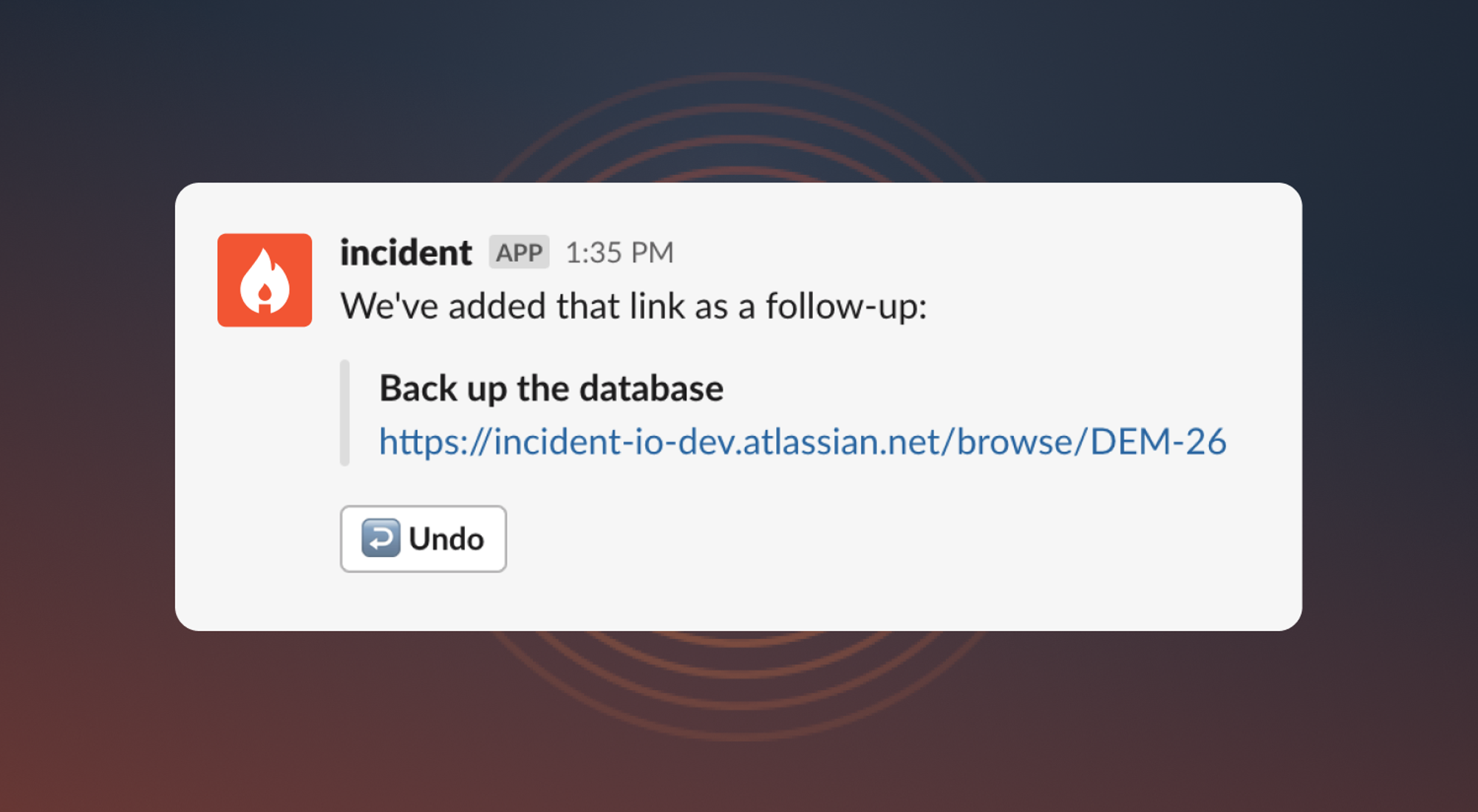 Sometimes, follow-ups for an incident are created in different places, such as Linear, GitHub or Jira. If you've got one of our issue tracking integrations installed, we'll listen out for links to issues. When we see one posted in your incident channel, we'll automatically fetch the issue and add it as a follow-up.