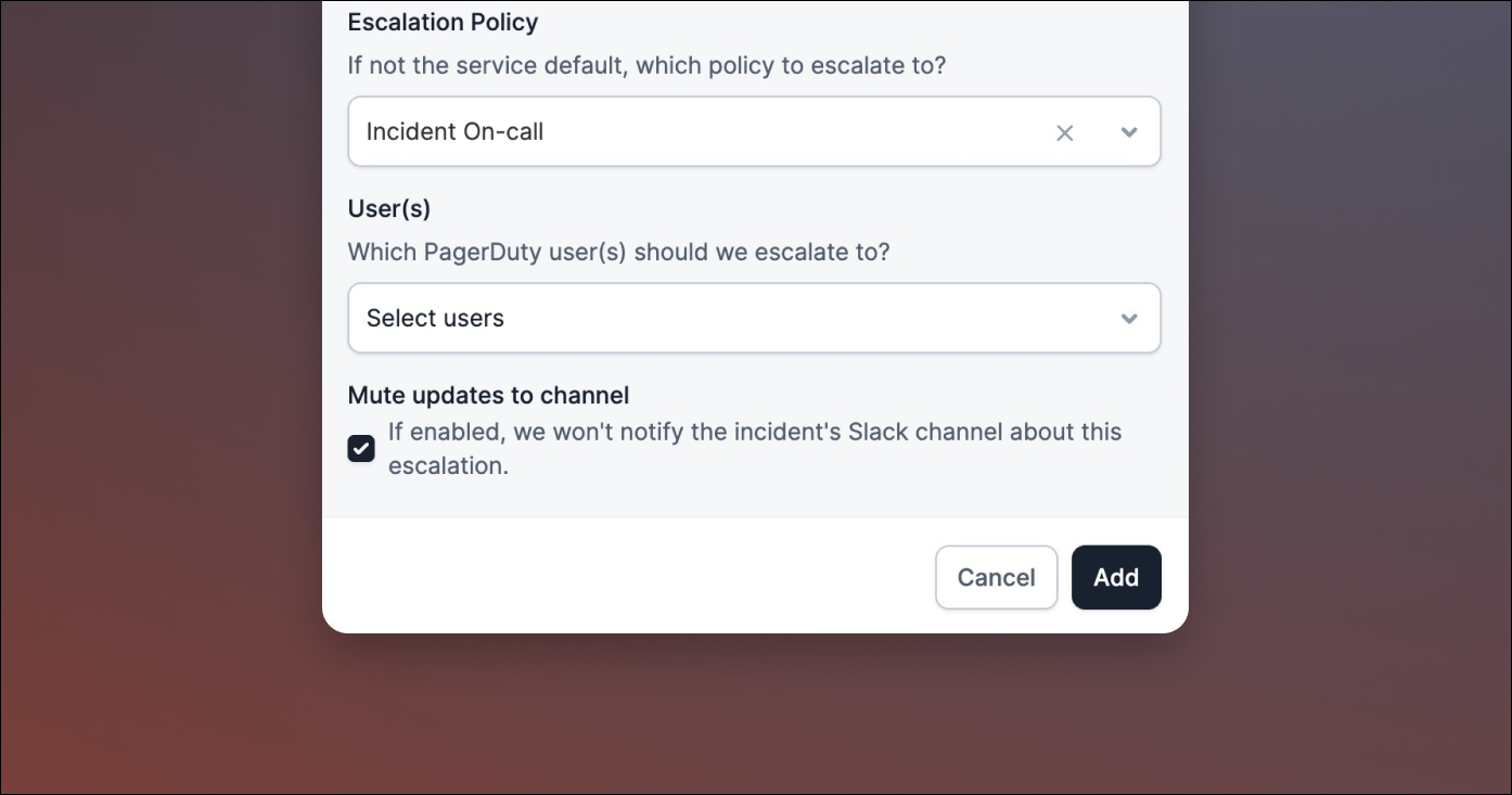 If you're using our 'Escalate' step to notify a person or a team via PagerDuty or OpsGenie, you'll see a new option to mute message updates to your incident's Slack channel. By default, this is unchecked, and you'll receive a message in your incident channel when the step is triggered (e.g. "We've notified Rory via PagerDuty"). But if you'd rather keep your incident channel quiet, you can enable that checkbox to prevent these messages from being sent when your workflow runs.