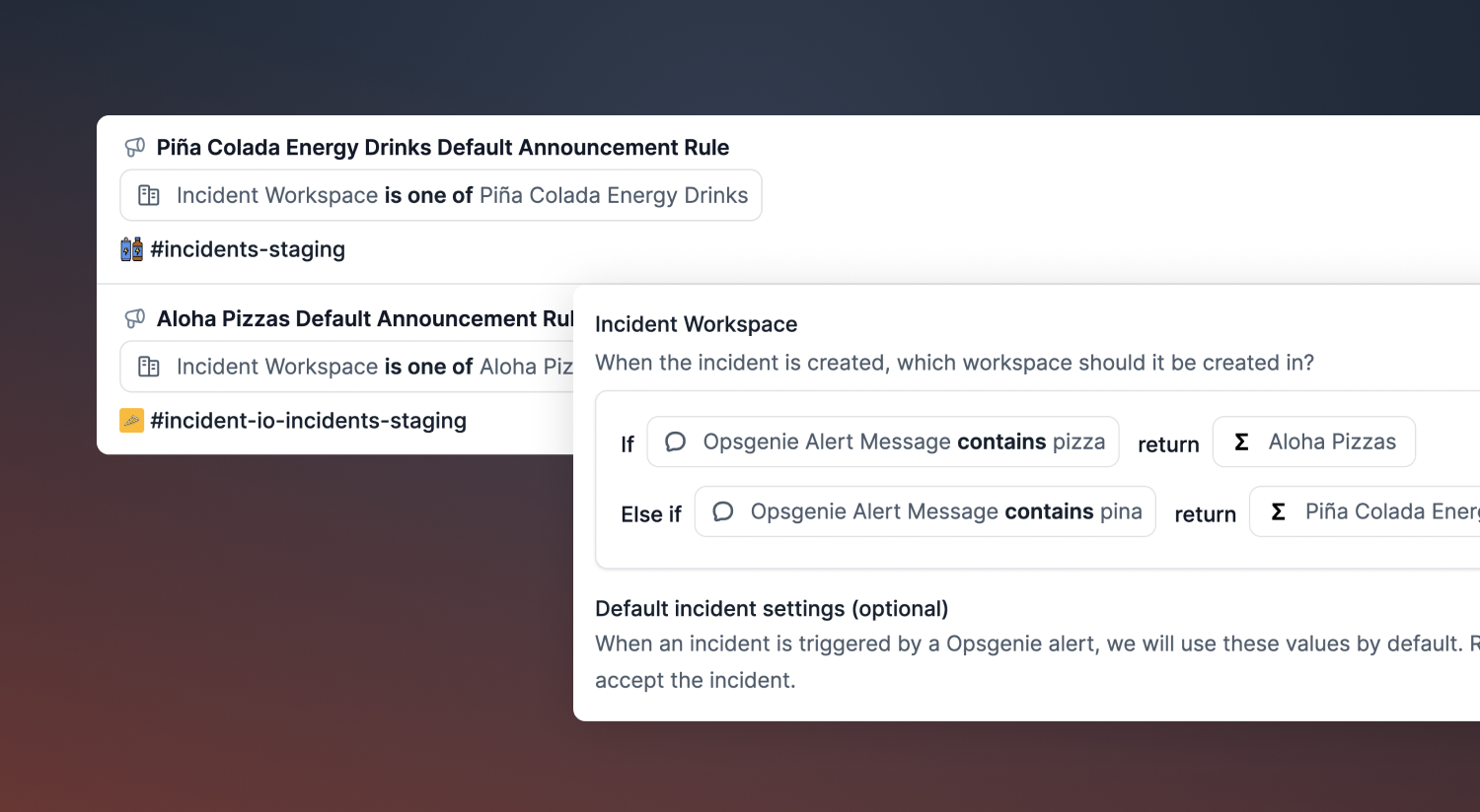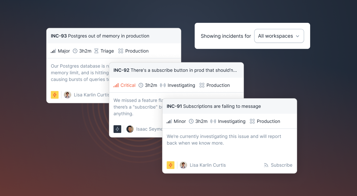 Settings such as custom fields, incident types, and severity levels will be available across all workspaces on your account, allowing you to standardize your incident management process across your organization. You could also customize workflow conditions to only apply for incidents for a given set of workspaces, allowing automations to adapt to different parts of your organization.