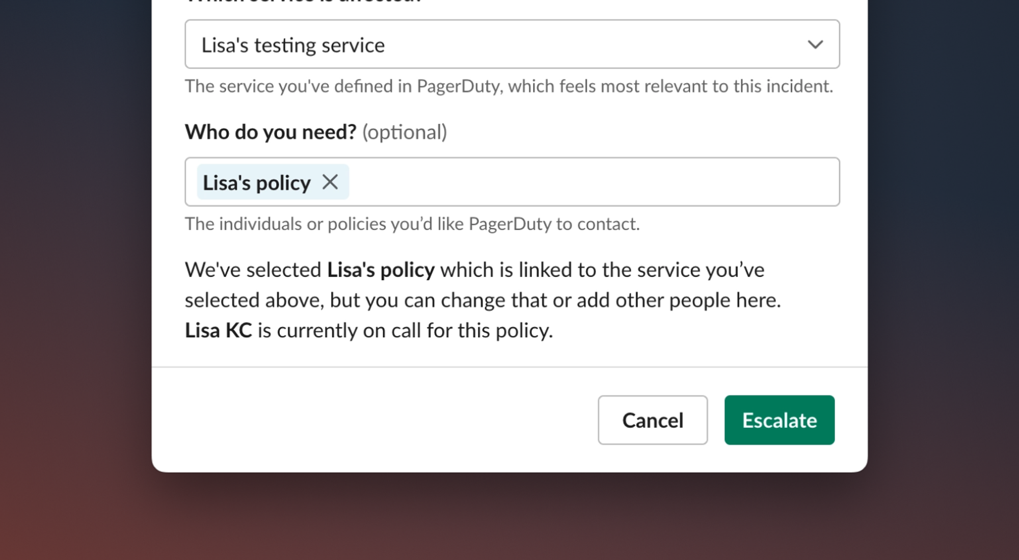 When you escalate via PagerDuty, we’ll now show you who you’re about to page. That helps confirm that you've chosen the correct service, and also makes sure you aren't about to inadvertendly page yourself (which I have definitely not done before).