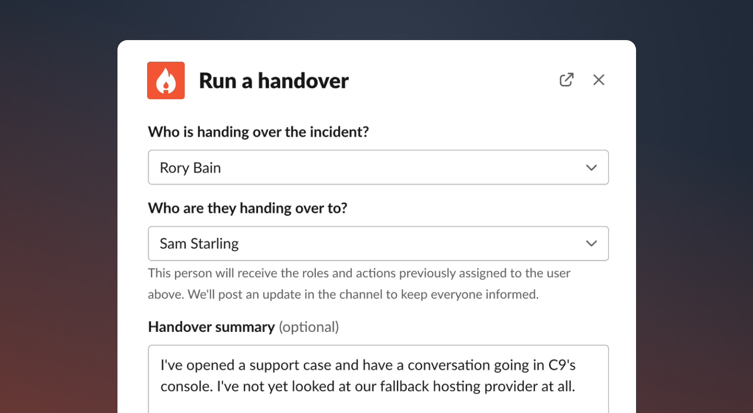 When dealing with larger incidents, it's not uncommon for someone to need to tap out of an incident, and for someone else to take over. It might be that someone's on-call shift is coming to an end, or perhaps the incident has been running for several hours, and you need a fresh pair of eyes, or you want to give the original responder a break.