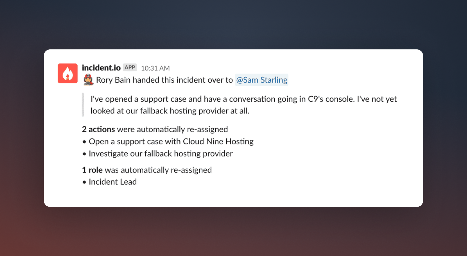 When you run a handover, we'll post a message summarising its details in the incident channel so that everyone is aware of the change. Additionally, we'll make a note of the handover on the incident timeline, so that you can see who was involved in the incident and when.