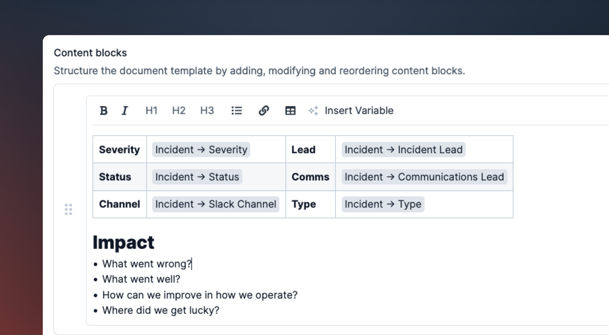 We’ve added the ability to use tables and lists within a postmortem template, as part of our existing Custom Block type. We wanted to add further flexibility to be able to map your existing postmortem document format in to our platform, and ensure you have the correct information in the correct format.