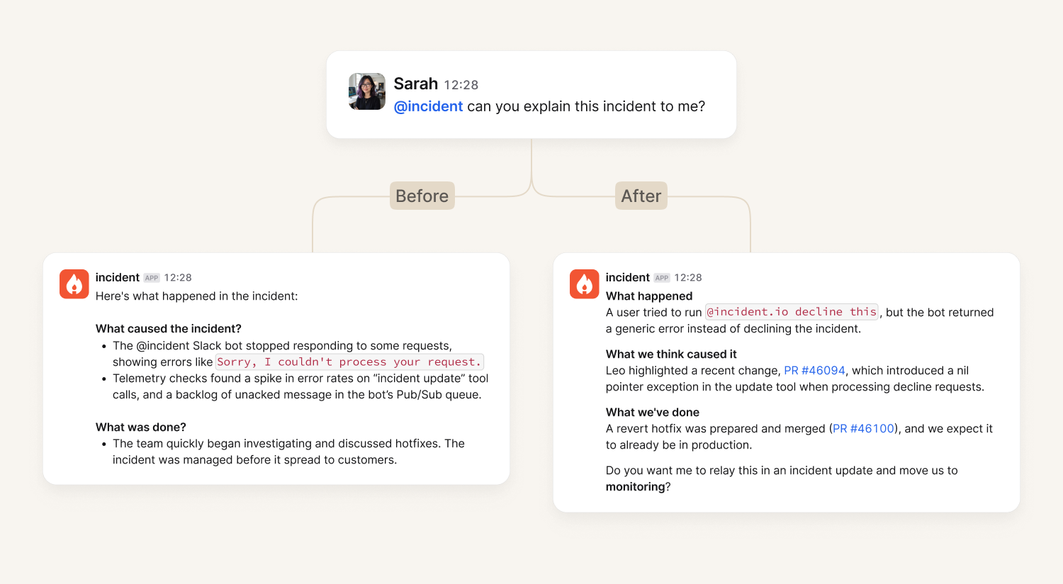 @incident won’t waste time giving you information you didn’t want. Simple questions like “who is the lead?” now receive one-line answers, but questions about technical concepts still go into detail.