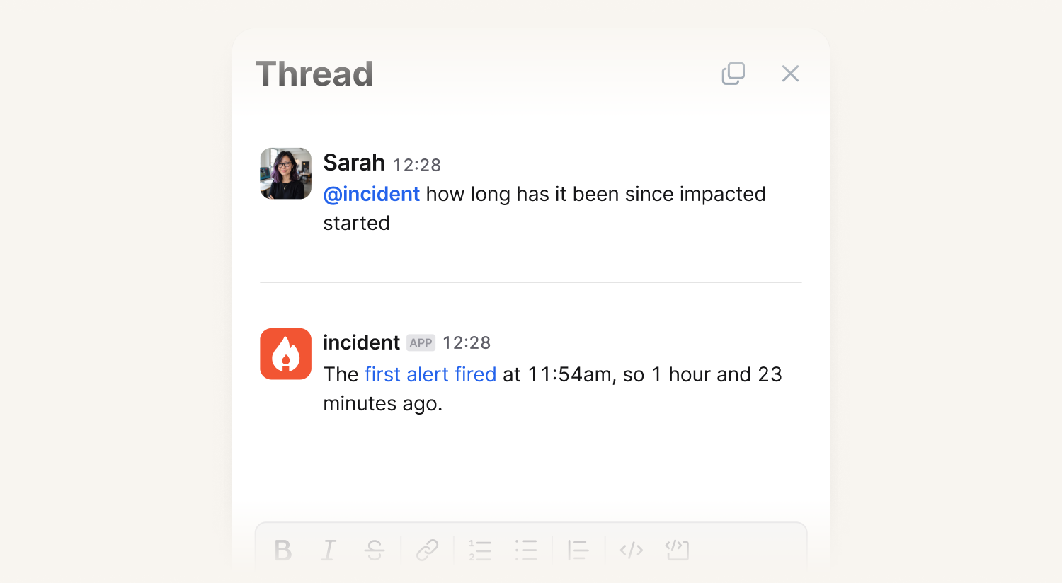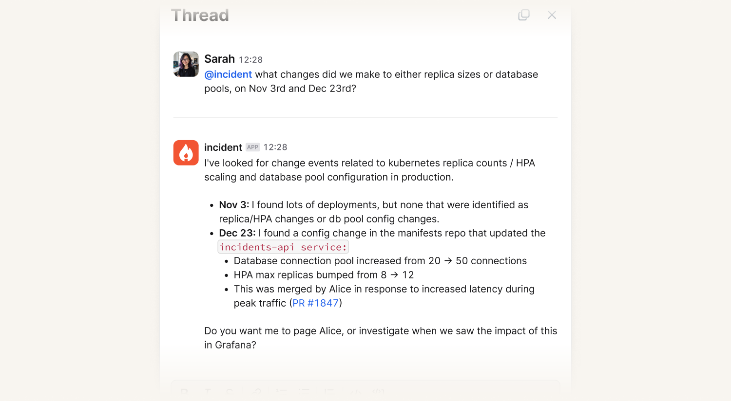 There’s a real-life example from a production incident of ours below, when a user asked @incident to explain the current incident.