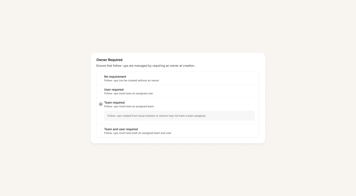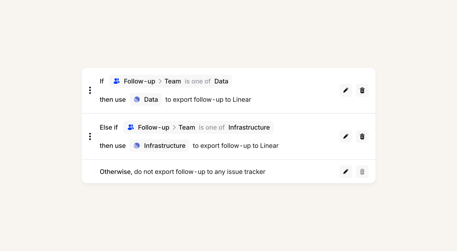 You want smarter automation - Use team assignments to trigger the right auto-export templates. Infrastructure follow-ups can automatically go to your engineering Linear workspace, while security follow-ups route to your security Jira project.
