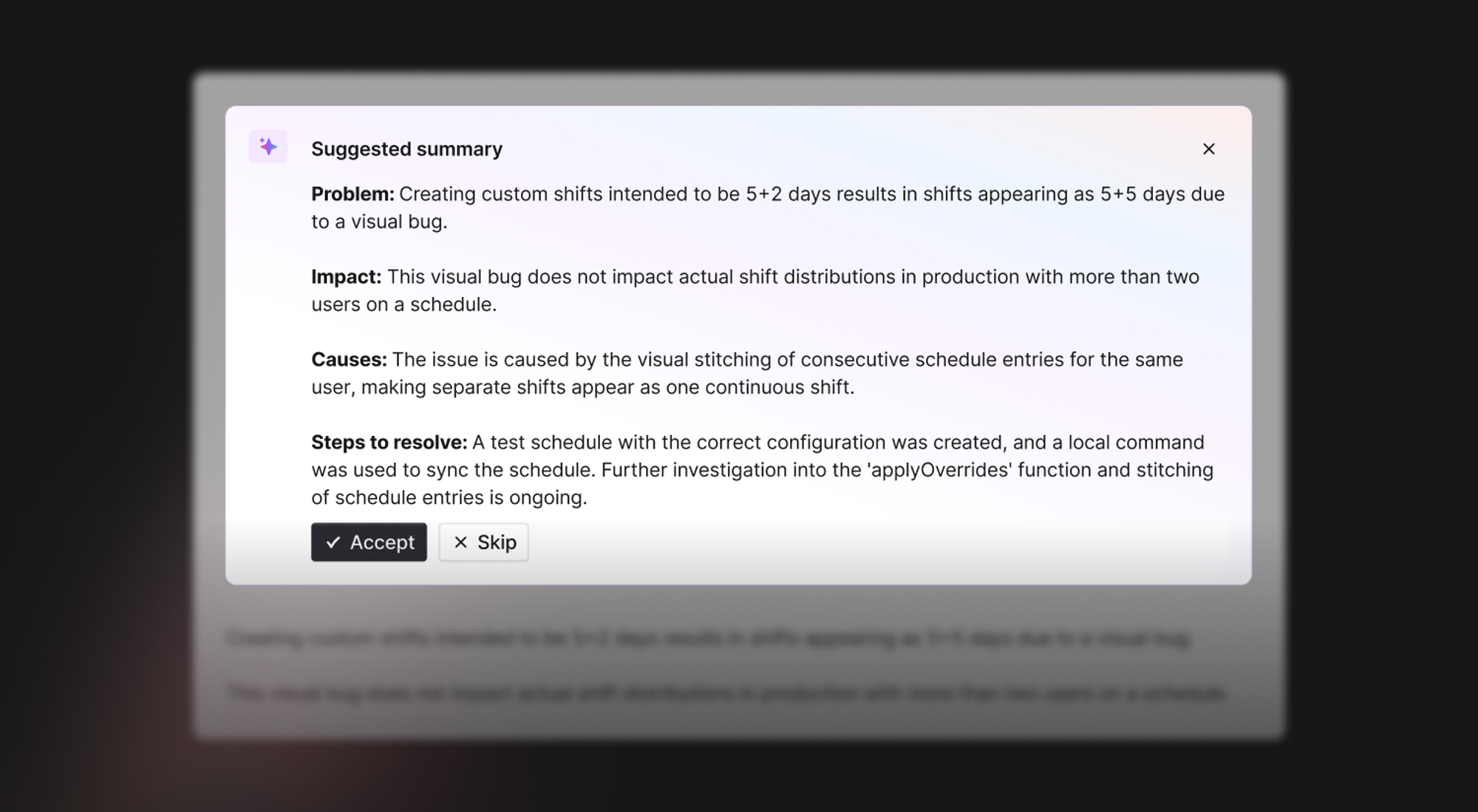 With suggested summaries we highlight an up to summary for you at the top of the incident page that you can quickly accept, skip, or edit without having to spend trawling through what’s happened yourself.