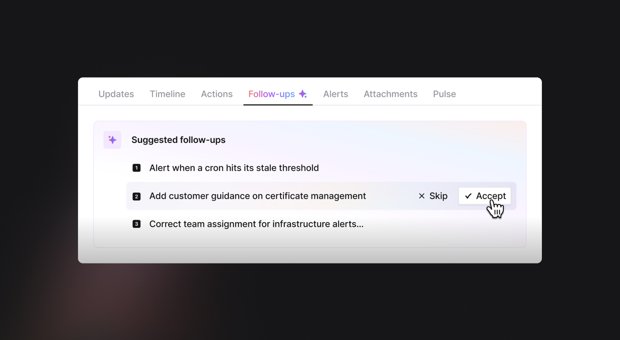 In the heat of the moment you might have mentioned something you needed to do then later forgotten about it. To help avoid and save you some time checking the moment an incident resolves, we will look back through the channel and spot anywhere follow-ups were discussed.