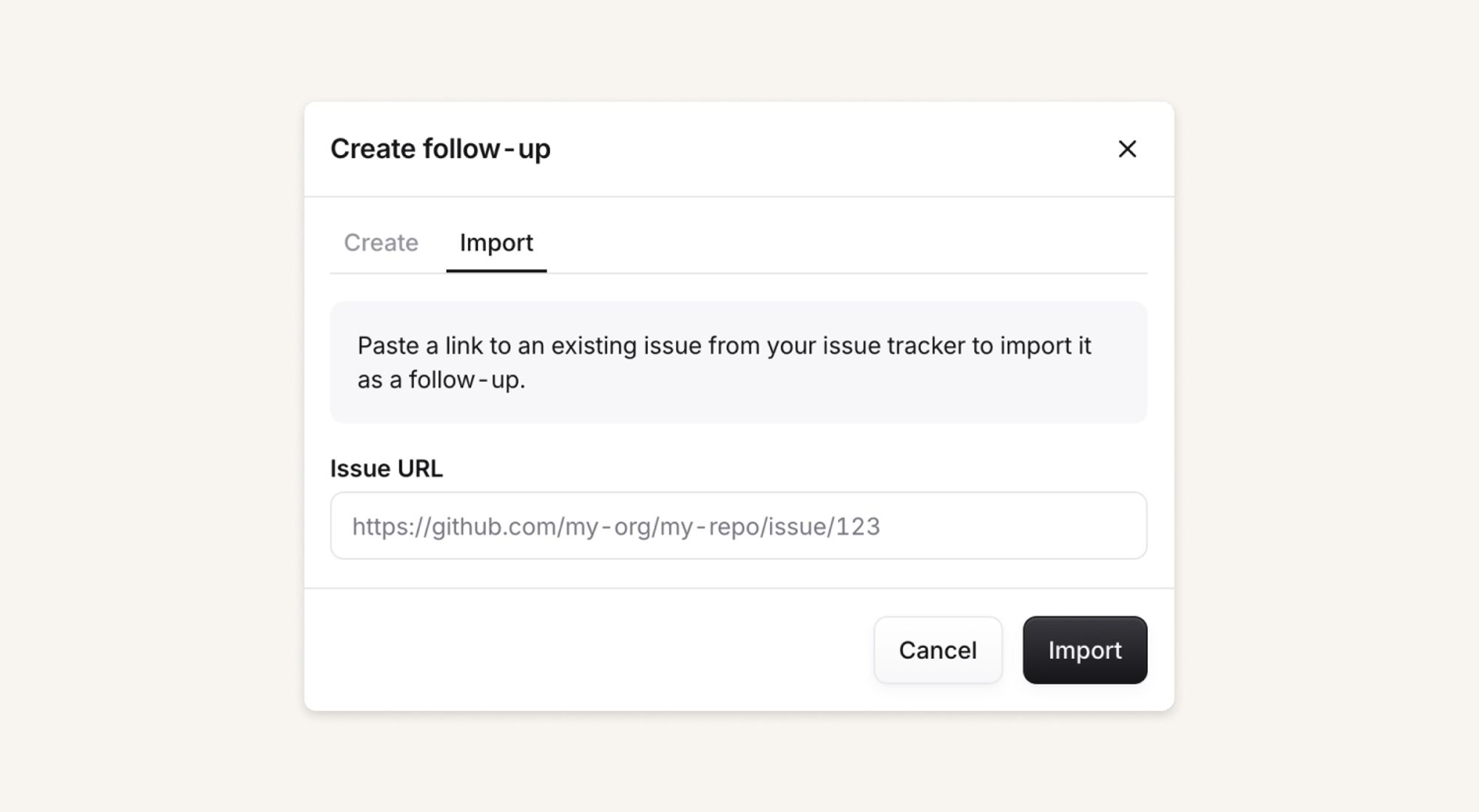 If you've already created a ticket in your issue tracker (e.g. Jira), you can now 'import' it as a follow-up from the incident homepage in the dashboard. This used to only be possible by pasting the link into the incident channel.