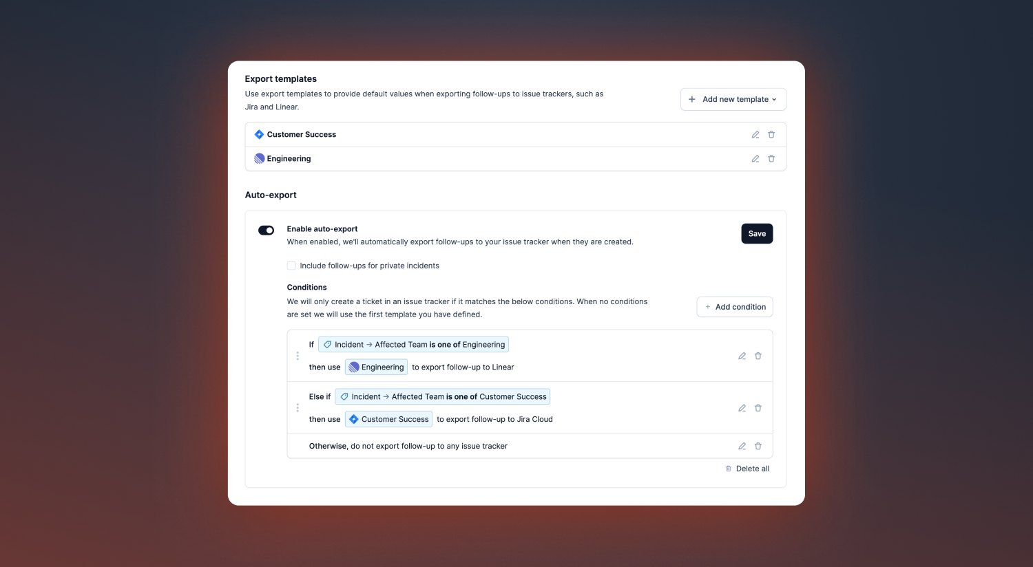You can further refine this process using conditions, allowing for rules-based automated exports. This allows for follow-ups to be exported to different issue trackers based on the incident they were created in.