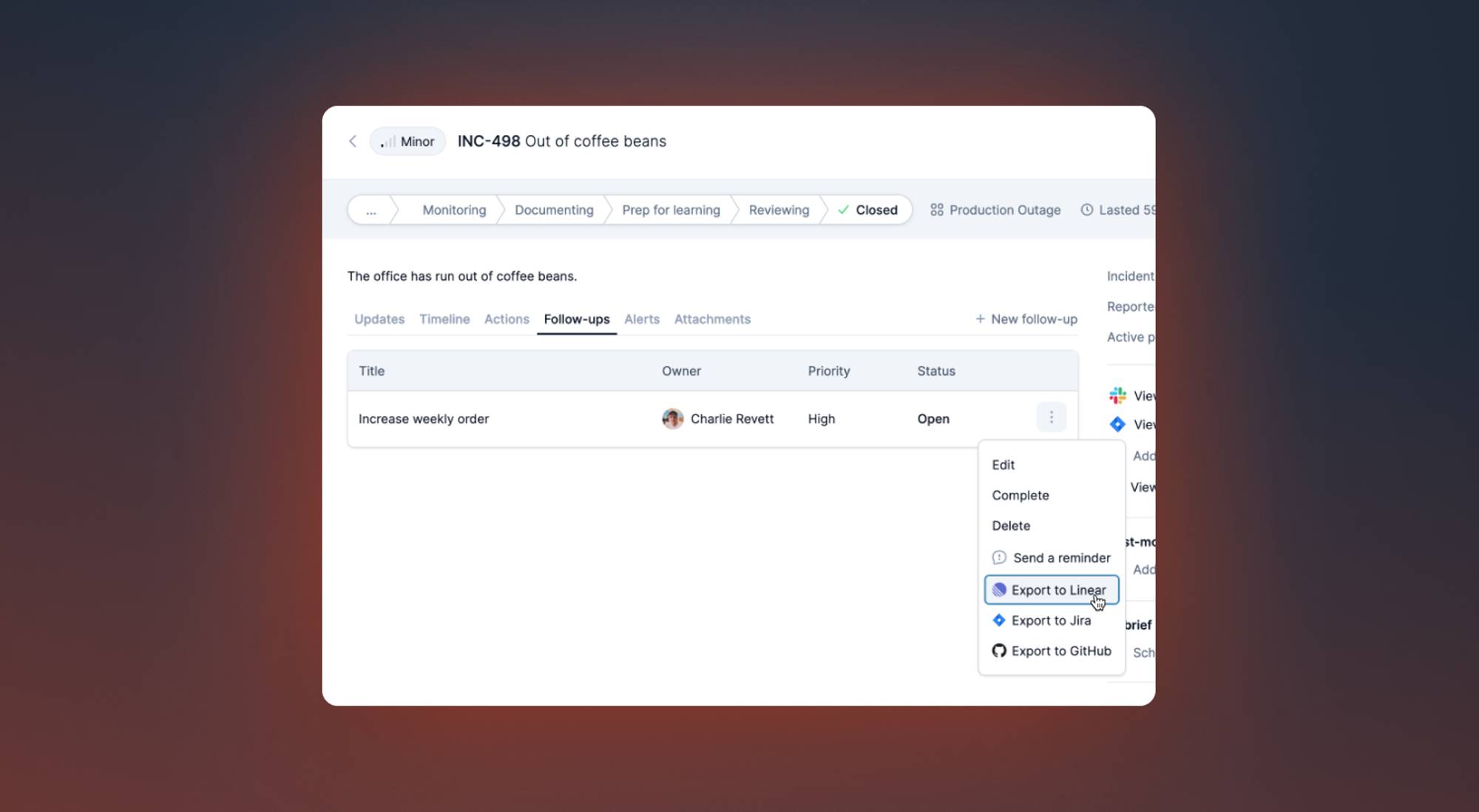 Before this launch, the process of exporting follow-ups from incident.io to your issue tracker was manual. It was a step that needed to be done, but it was time-consuming and left room for human error.