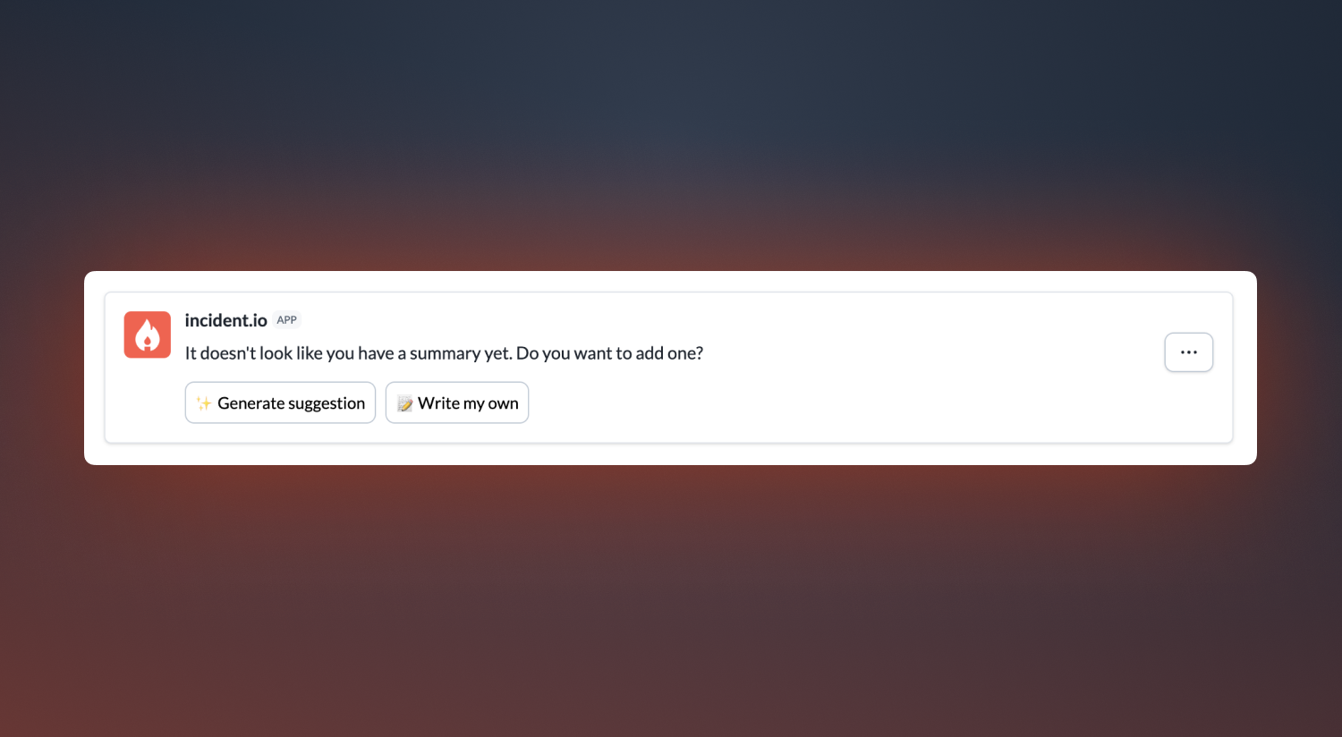 Previously, we would only suggest you a new summary whenever you provide an incident update. Now, there’s a shiny Generate button on the /inc summary and /inc resolve modals which will create a new summary for you!