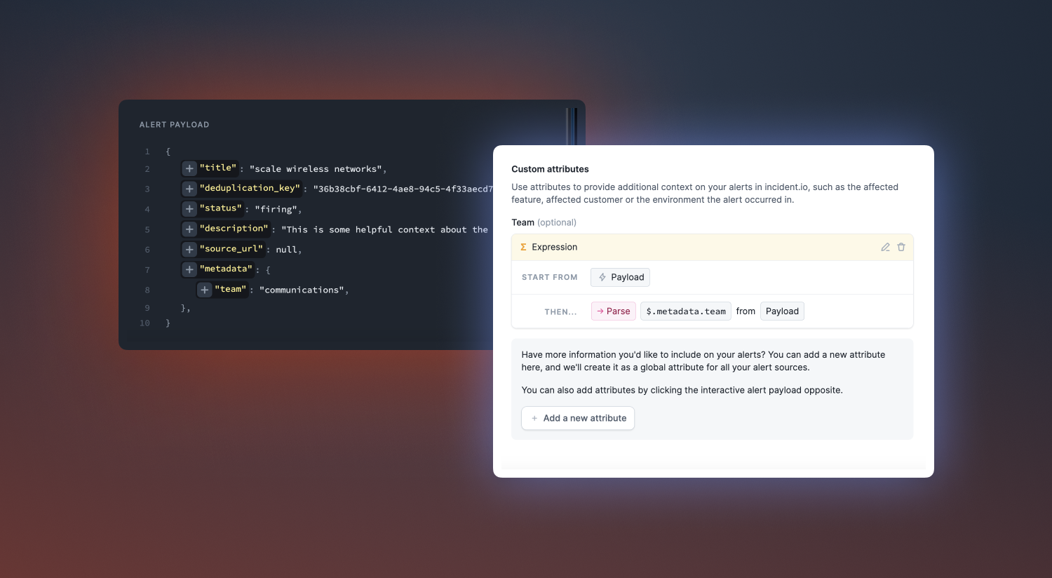 When connecting your alert sources to incident.io, you can add custom attributes to provide more context to your alerts. Examples include: team, affected customer, affected feature or environment. This allows you to pull values from your alert payload into rich data on your incidents.