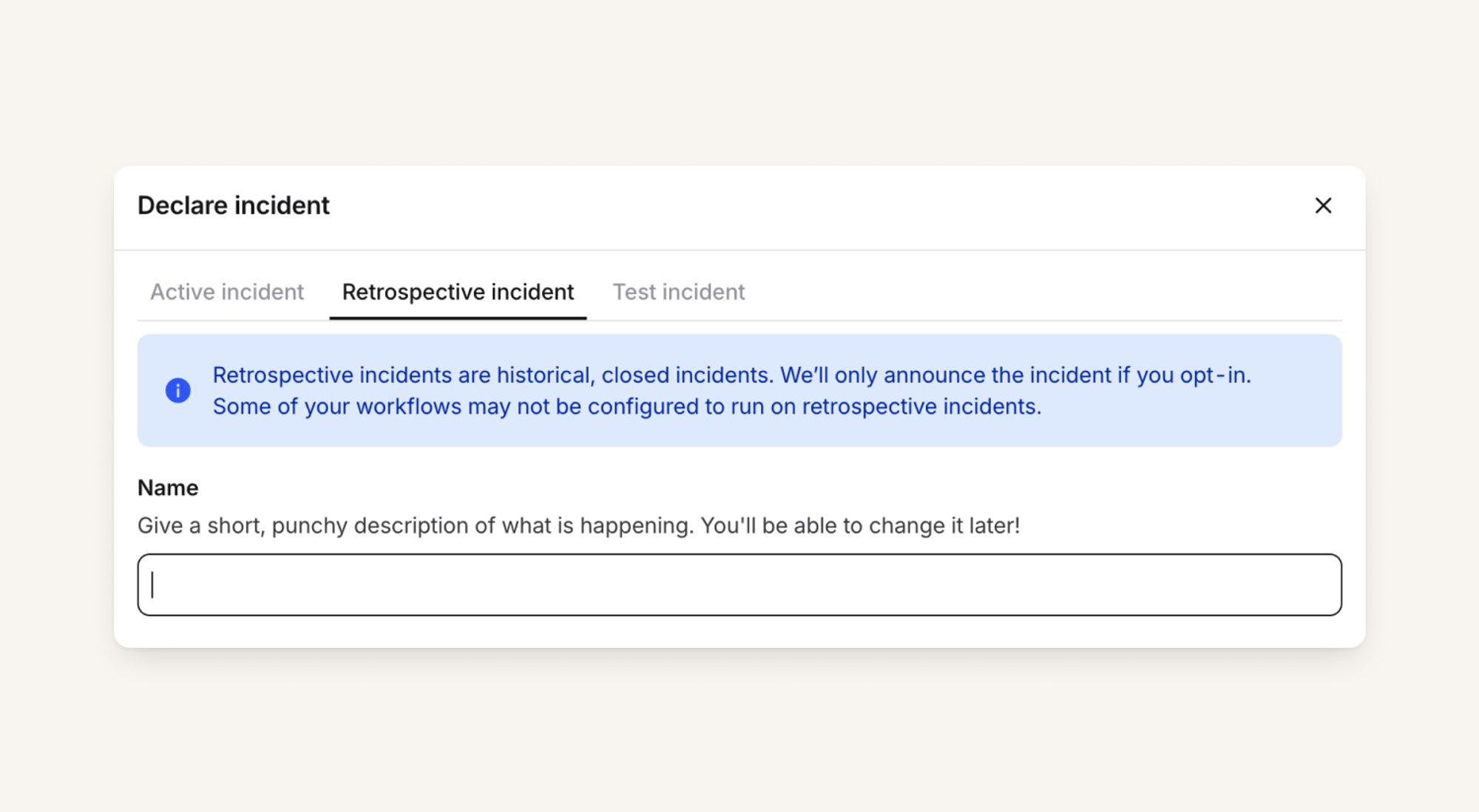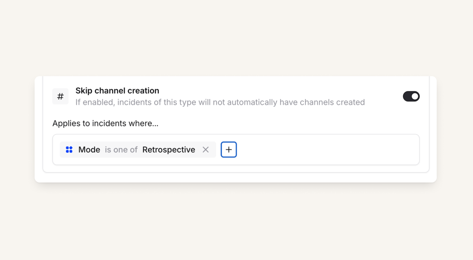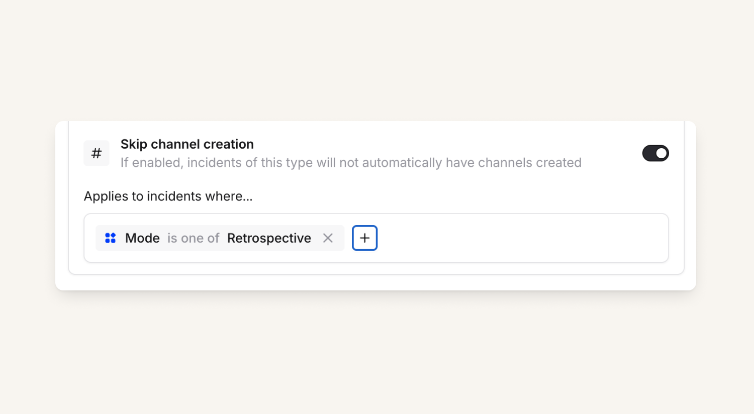 You can now add a condition on incident Mode under the “Skip channel creation” section of your incident type settings. As an example, this can be used to ensure that retrospective incidents don’t get an associated channel when you create them.