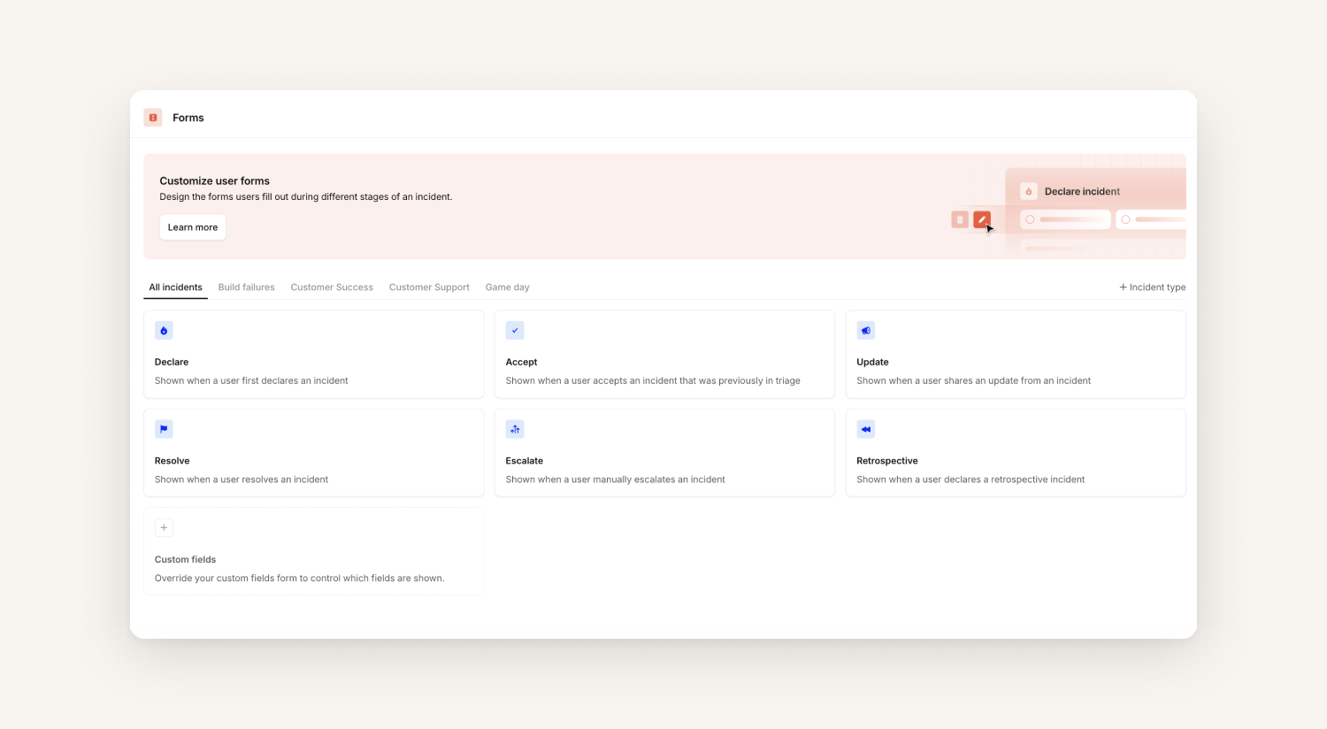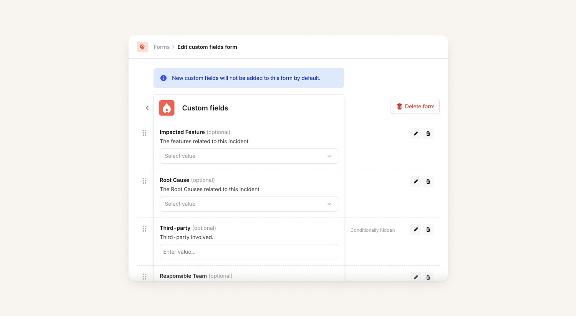 We already allowed form configuration for other incident forms (Declare, Update, Resolve, etc), and have now extended this to support the custom fields form: