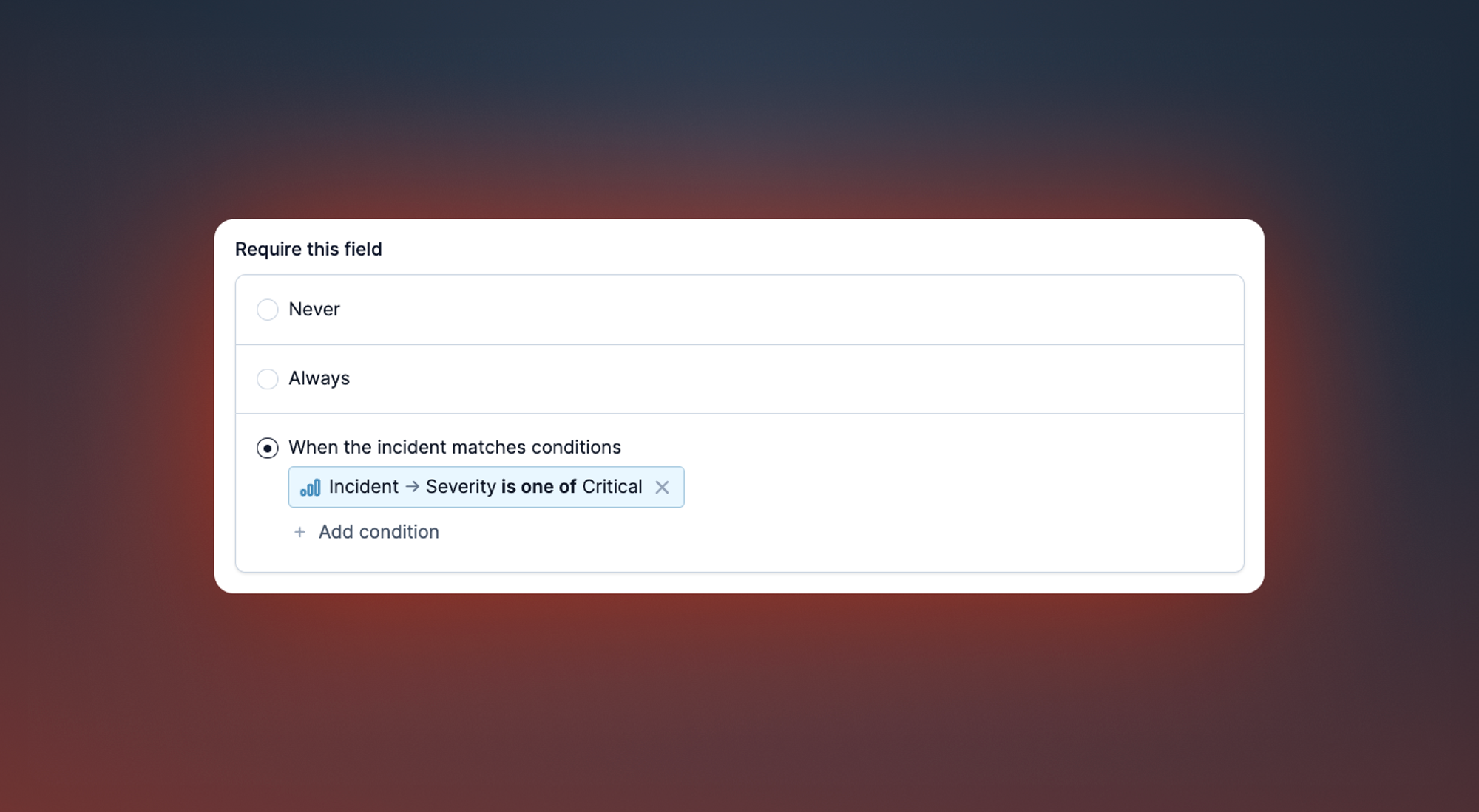 You can now choose when you want a field to be required: for example you might have a role Communications Lead which is required if the severity is Critical, but not for lower severity incidents.