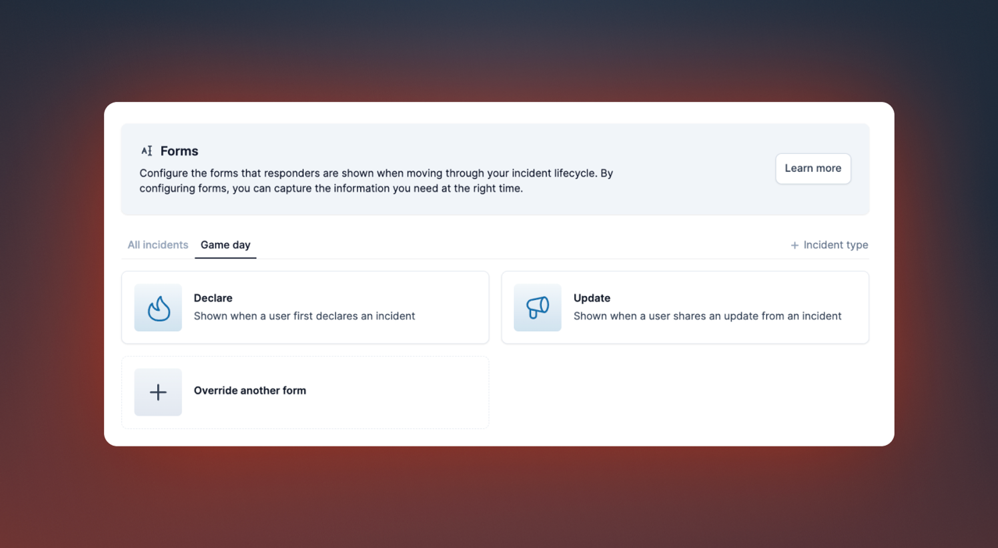 Not all incidents are equal (but yes, probably some incidents are more equal than others). You can now configure a bespoke form that’ll only apply to incidents of that particular type.