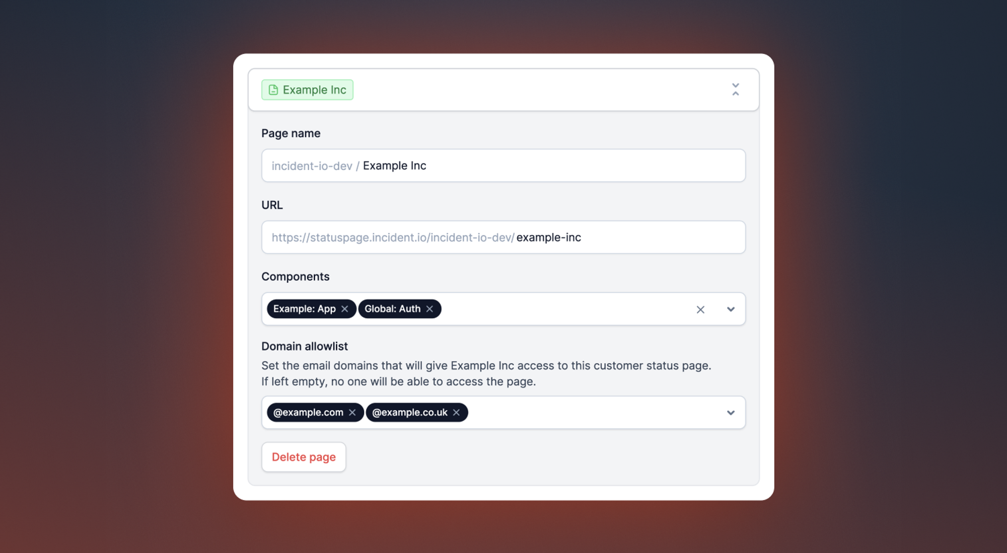 With customer status pages, you don't need to add every email address that should get access. Instead, you specify which email domains get access to a page, such as @incident.io. This makes it easy to manage access for an entire organisation, instead of having to go back into your configuration every time your customer needs another person added to their status page.