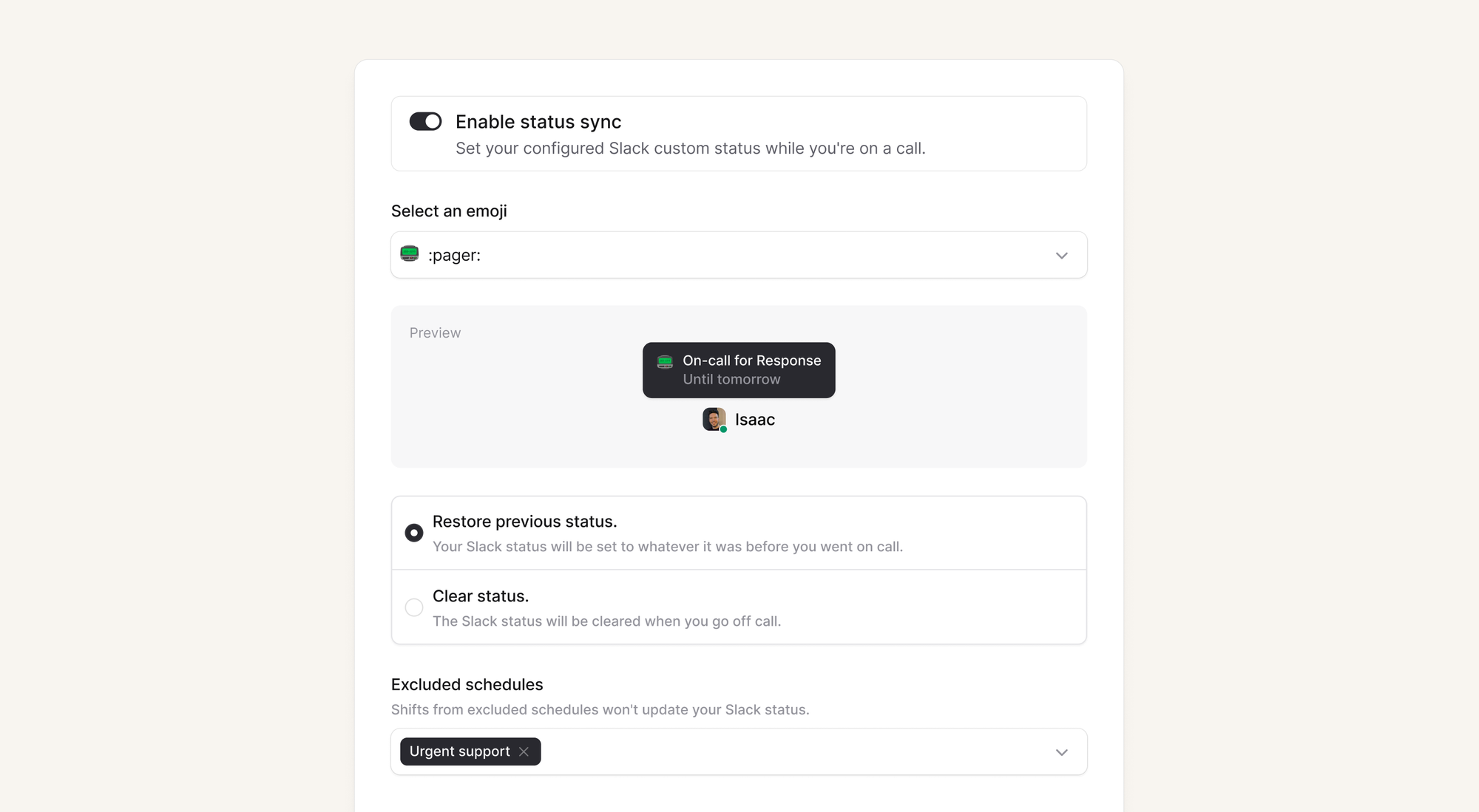 We can set your Slack status when you are on call. When your shift ends, we'll either reset your status to whatever it was before, or clear it.