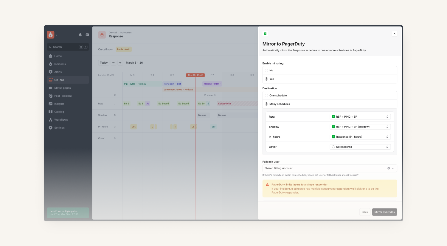 So, we’ve built out the ability to mirror schedules from incident.io to PagerDuty. This allows you to use the sparkliest bits of our product and have that reflected into PagerDuty until you are ready to fully migrate to our product.
