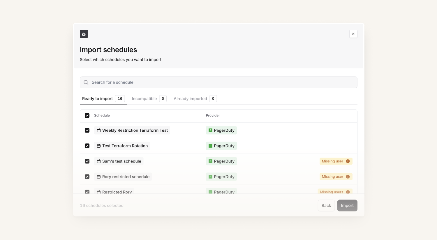 While we could import schedules directly from PagerDuty and Opsgenie for a long time now, we now allow you to bulk import. This is a great timesaver if you have loads of schedules you want to import at the same time.