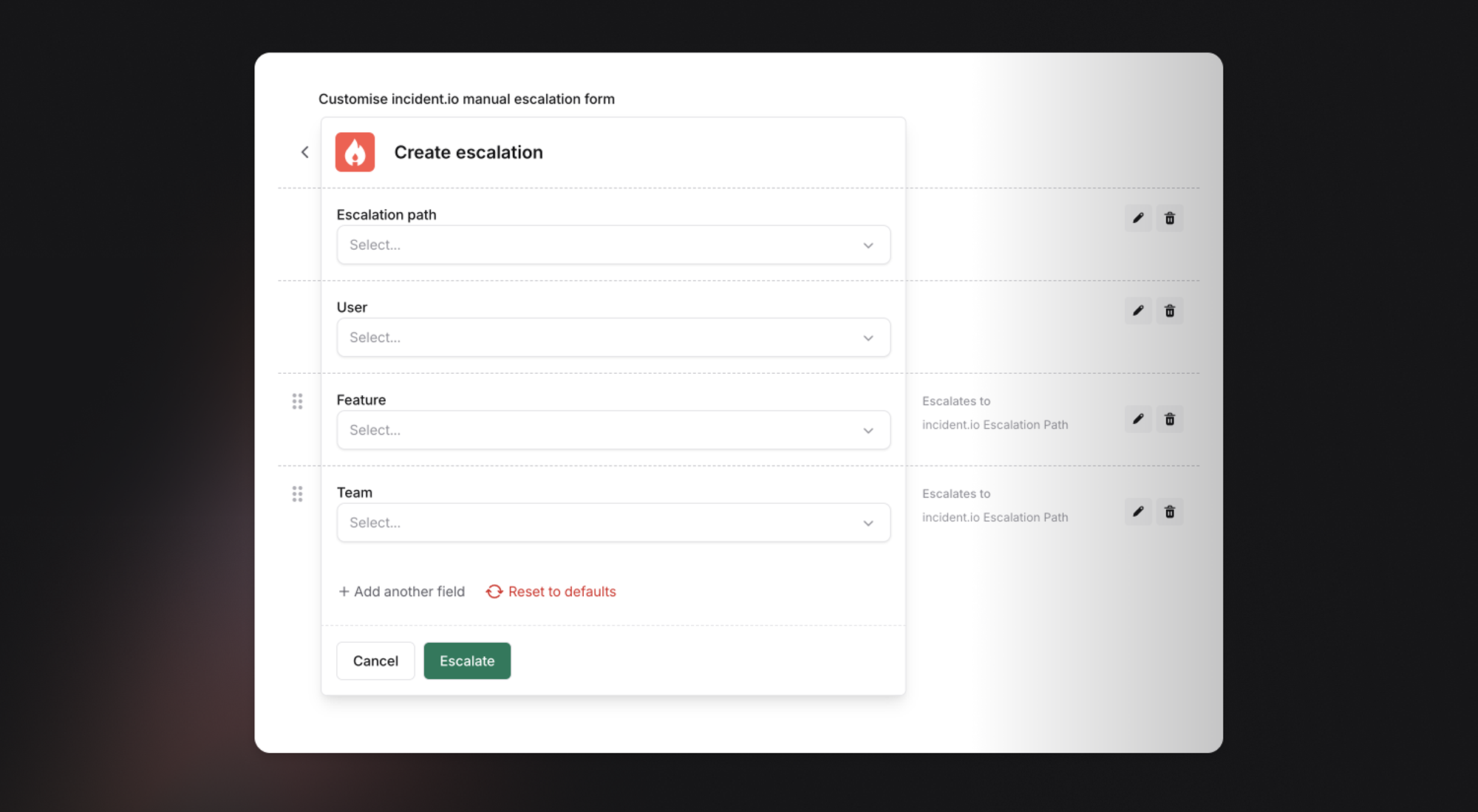 Now, you can configure manual escalations so that you just have to pick a Team, and we’ll figure out if we escalate through incident.io, PagerDuty, and/or Opsgenie, based on what’s configured for the chosen team in Catalog.