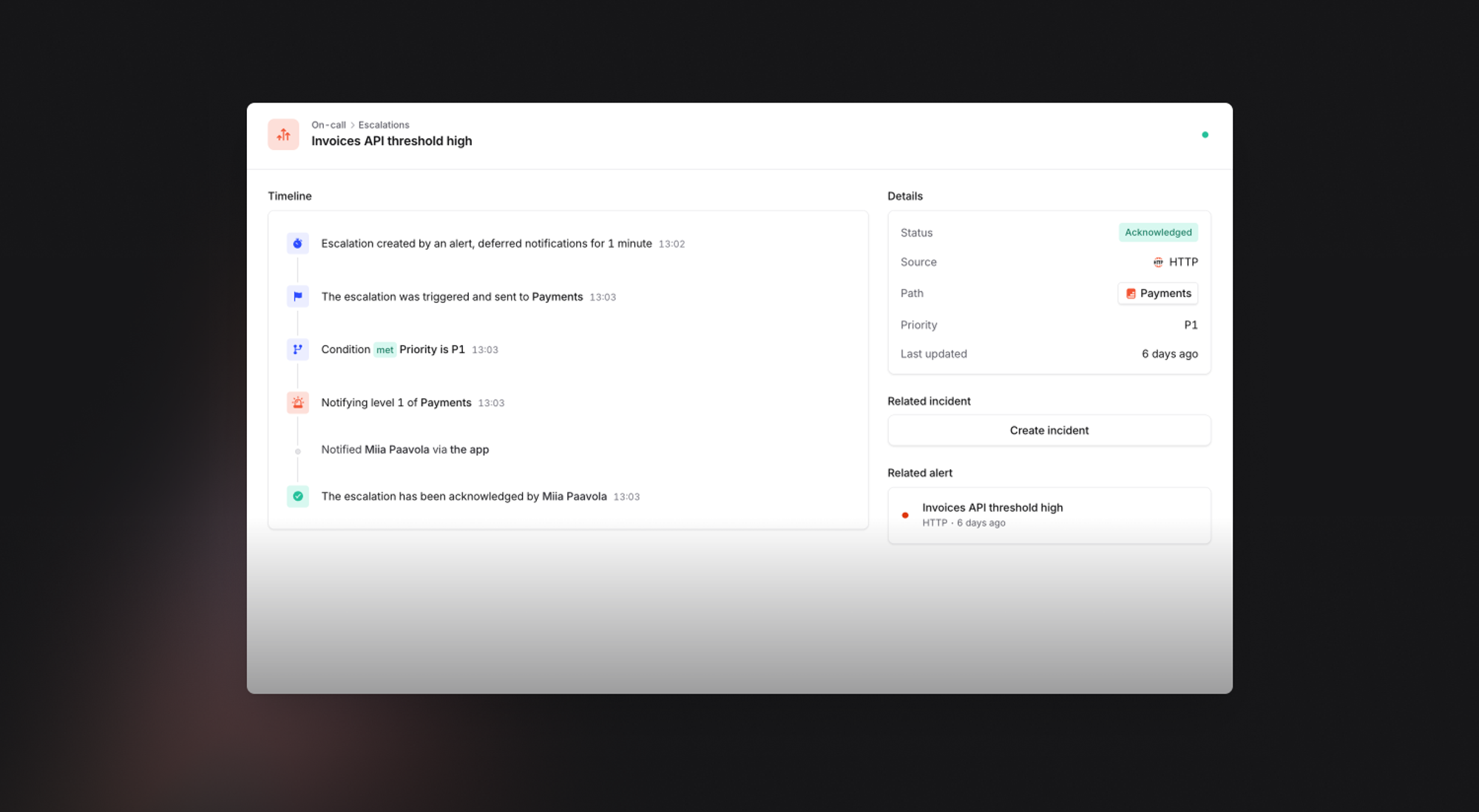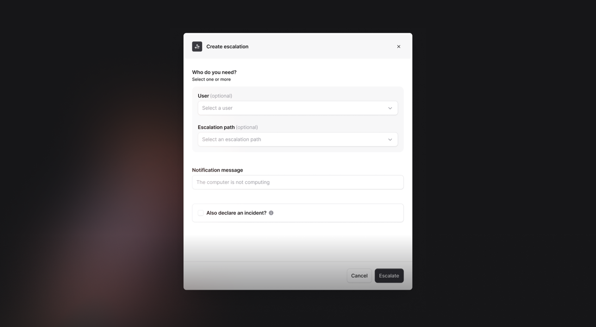 You can now easily escalate to anyone in an organisation without creating an incident, straight from the dashboard, Slack, and the app. You might use this to investigate an alert before starting your full incident response workflow, or why not to get the attention of a coworker to come back to your booth at the conference?