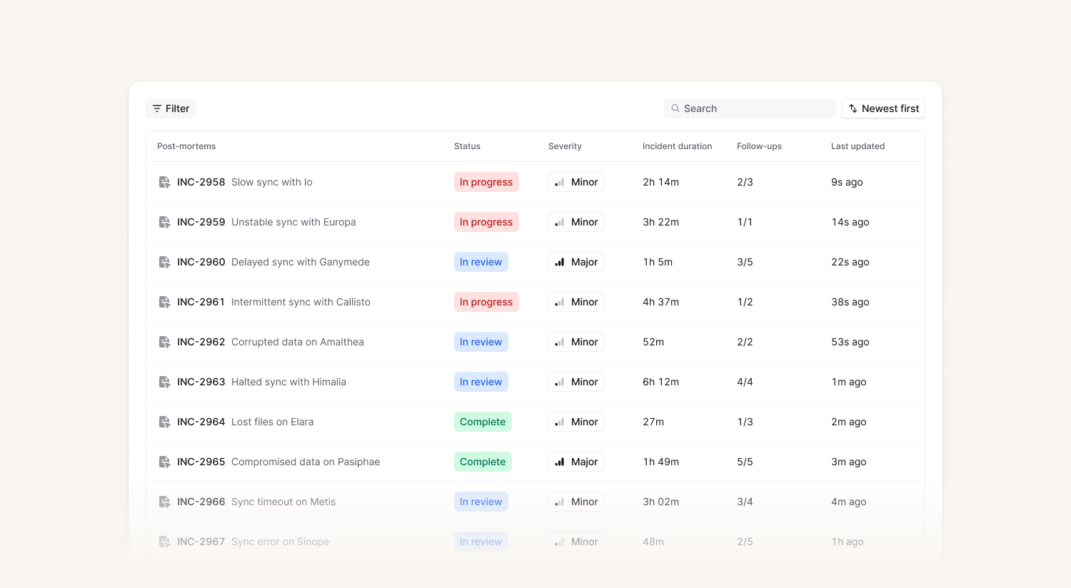 This enables managers and stakeholders to keep track of the overall progression of post-mortem documents, as well as ensuring that they all end up in a completed state. You can find some additional bells and whistles such as the count of follow-ups completed.