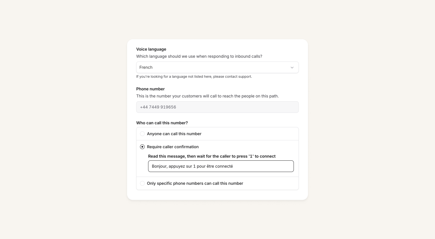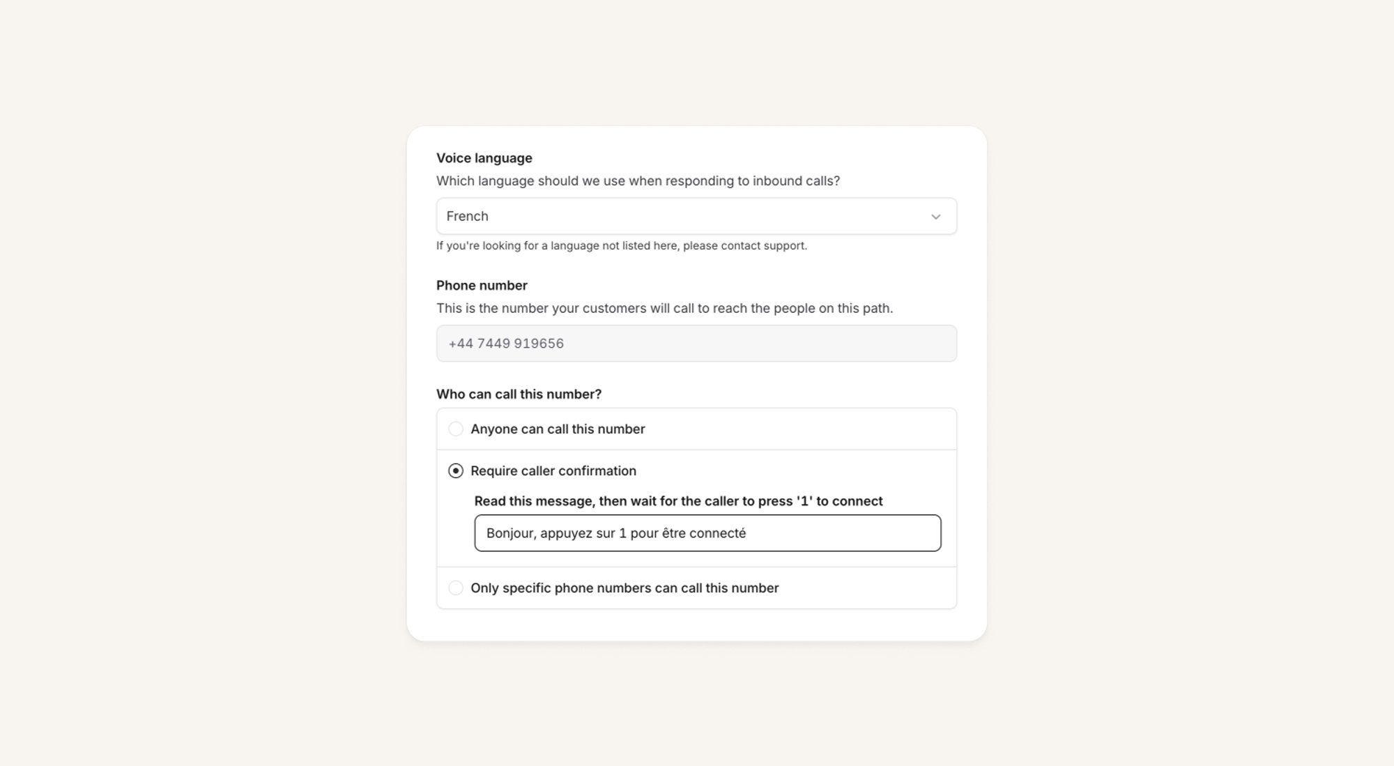 You can now pick the language you would like to use when responding to inbound calls in live call routing, instead of defaulting to English. Simply go to ‘Edit call route’ and select your preferred language. If you find the language you want isn’t supported, just ask customer support and we’ll add it!
