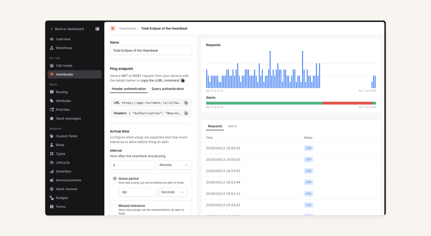 You can set up your heartbeats under Settings → On-call, then connect them to any alert routes to ensure the right people know when a system is down.