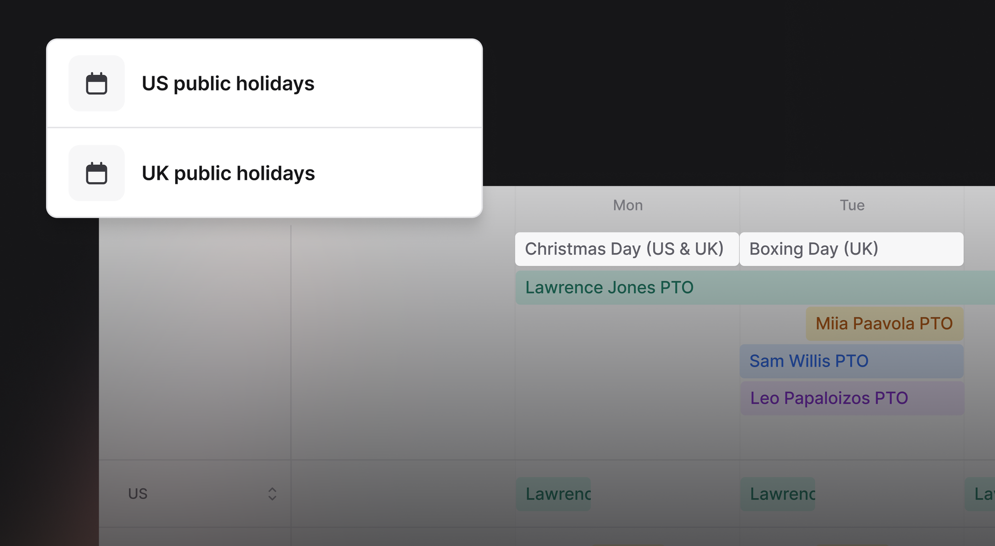 When planning ahead, you’ll automatically see which public holidays are coming up without having to navigate out of your schedules.