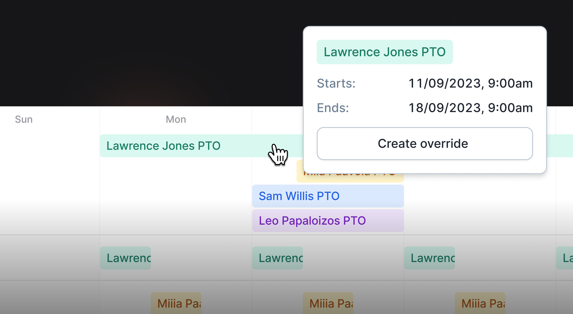 With a view of your team’s personal holidays and your local holidays on your schedule, you can easily see if a holiday clashes with someone’s shifts, or if a specific day needs additional cover - simply hover over the holiday in question to create an override!